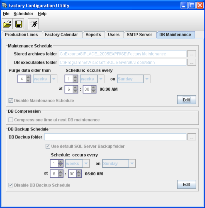 Installation and Configuration Guide SIPLACE Explorer 4 Configur ation Edition 11/2020 EN 4.2 Configuring the Factory C onfiguration Uti lity 7 5 4.2.7 DB Maintenance Define the ma intenance s chedule for the factory dat…