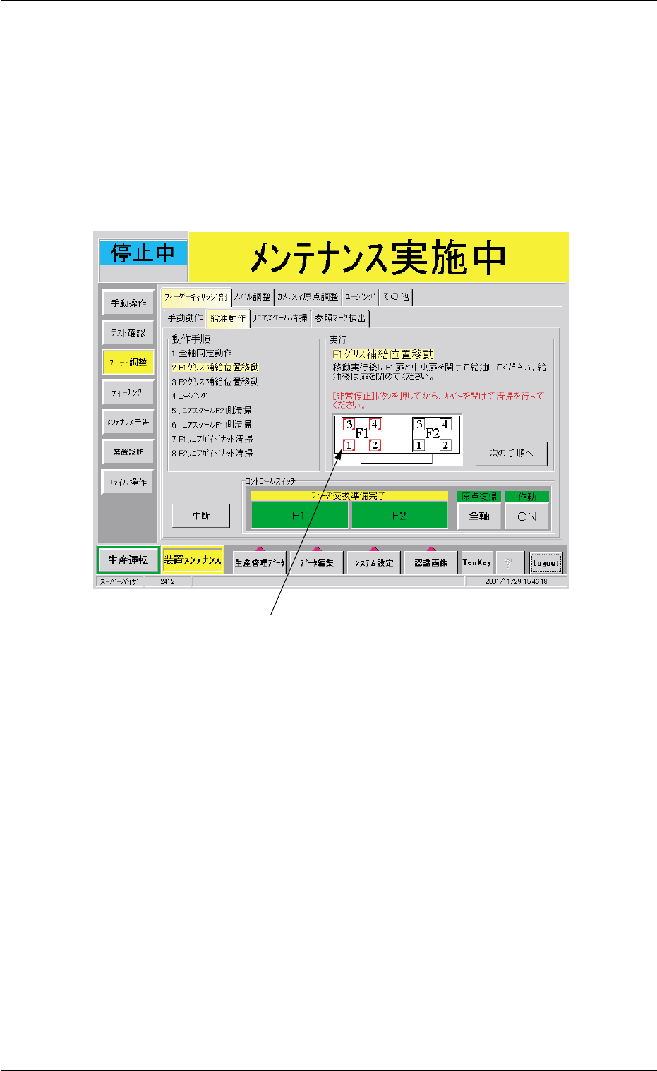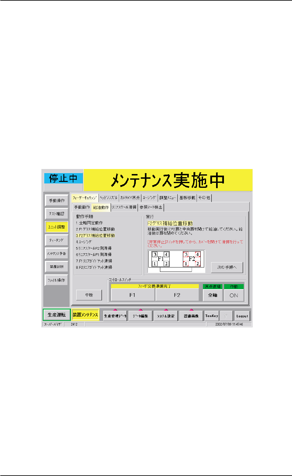 (5) 作動 [ON] ボタンを押し、 2 秒以内に操作パネルの [ENABLE] ボタンを 押します。 全軸同定動作が行われます。 ( フィーダキャリッジが少し動きます) (6) 作動 [ON] ボタンを押し、 2 秒以内に操作パネルの [ENABLE] ボタンを 押します。 F 1 がグリス補給位置に移動し、以下の画面が表示されます。 Fig.4A85-3 (7) [ 非常停止 ] スイッチを押し、 F 1 扉と中央扉を開けます。 …