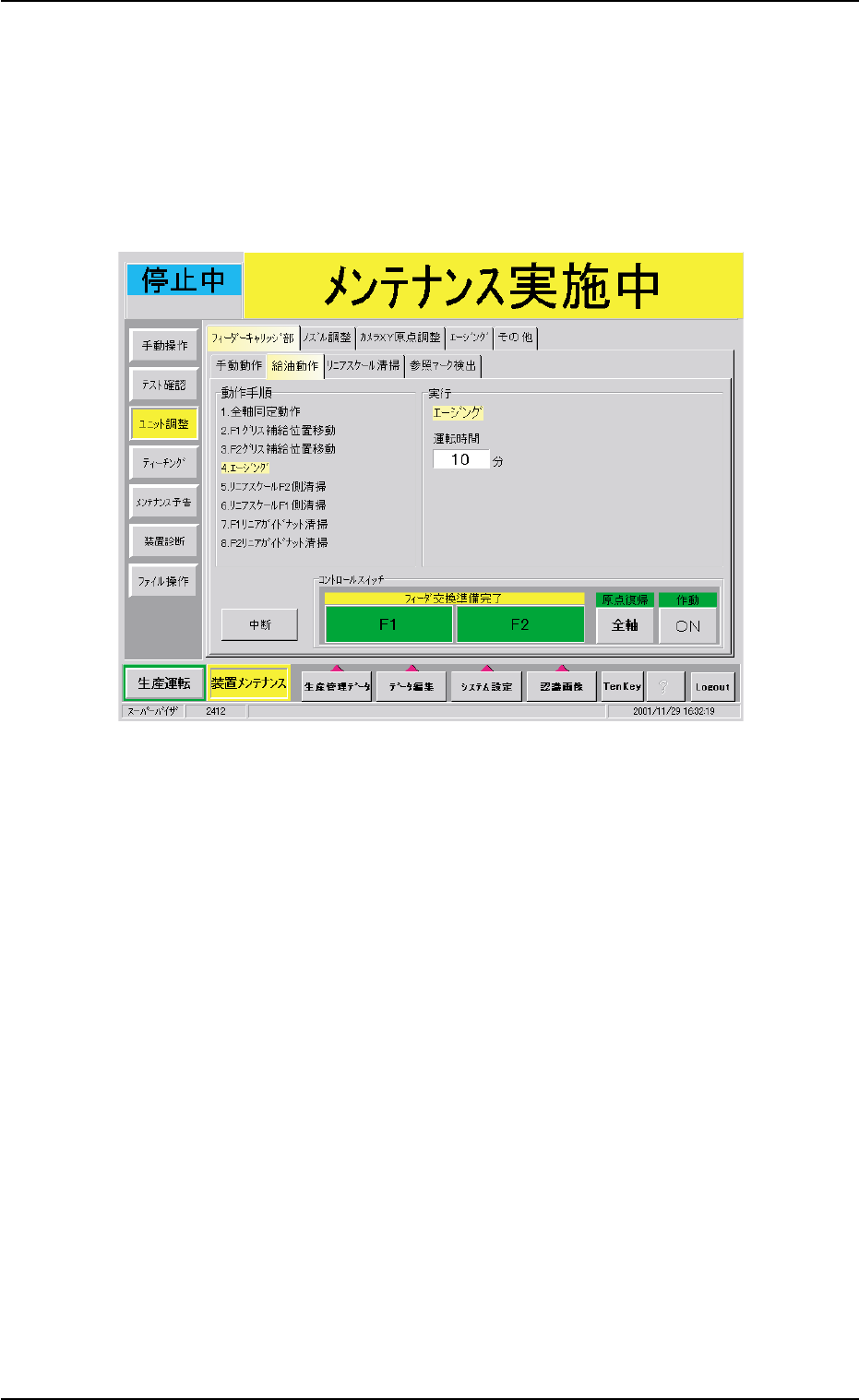 と、フィーダキャリッジ部のエージングが始まります。