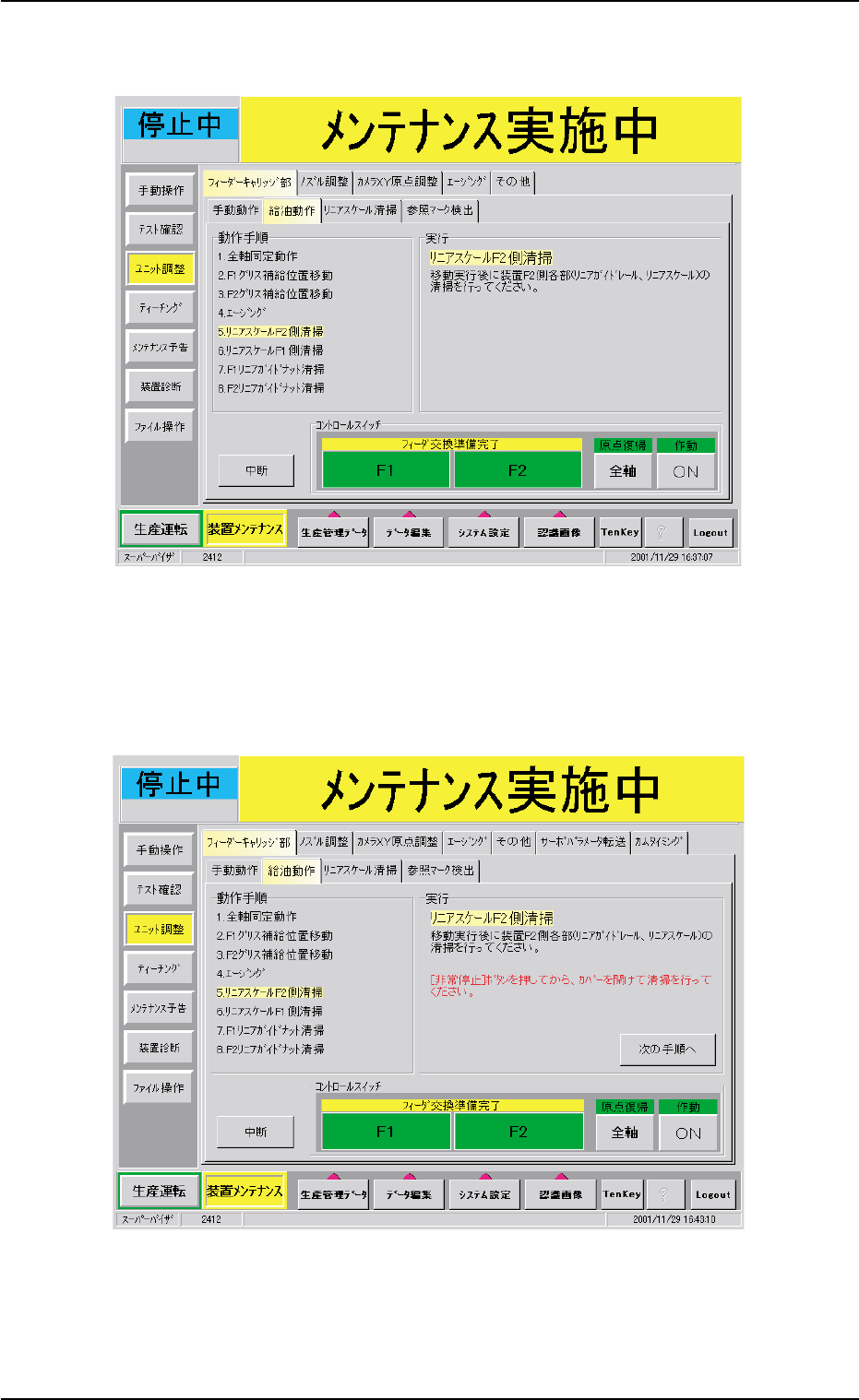 (17)フィーダ交換準備完了[F1]、[F2]ボタンを押します。