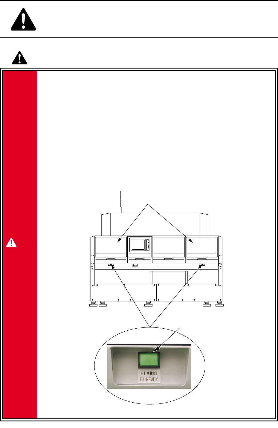 安全 - 10 AHM01J-P 安全にお取扱いいただくために 041 1-001 “フィーダキャリッジ部” 生産運転時の注意 • フィーダキャリッジカバー、フィーダ作業エリア安全扉を開けての生 産運転は、絶対に行わないこと。 フィーダキャリッジに人や物が接触すると、重大な事故となります。 生産運転前には、フィーダキャリッジカバー、フィーダ作業エリア安全扉が 閉まっていることを確認し、開いている場合は、必ず、閉めてください。 Fig. …