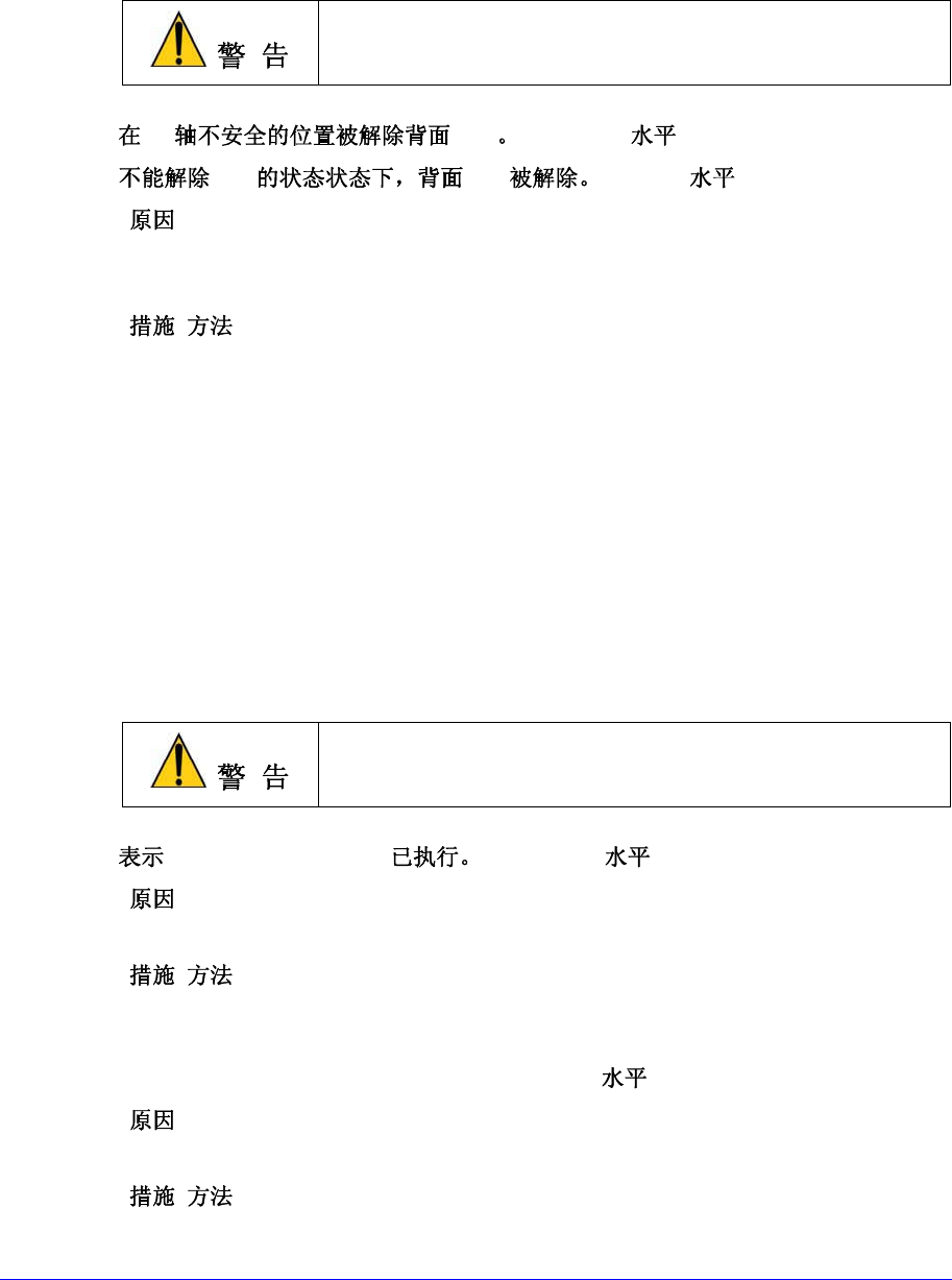 1-4 $0020 [EMER ] [ ] 前门开了。 前门传感器或配线部分错误。 [ ] 关掉后门。 按 ”READY” 按钮给设备的电动机 供给电源。 确 认传 感 器或 配线 部 后请 与本 公司 指 定的 C / S 公 司 ( ST S ) 或 当地 代理 店 (Lo ca l Agent) 联系。 紧急 停止时 ,因为 正在工作 的 Y1 和 Y 2 两个 马达会 出现停止 距 离的偏差导致 SKEW 错…