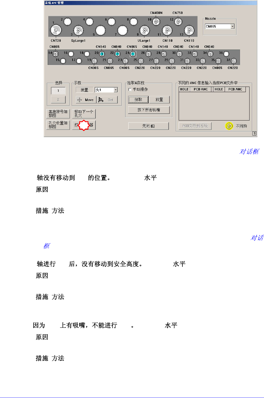 相应磁头上实际存在吸嘴,但在ANC菜单的对话框中设置为错误发生磁头上未