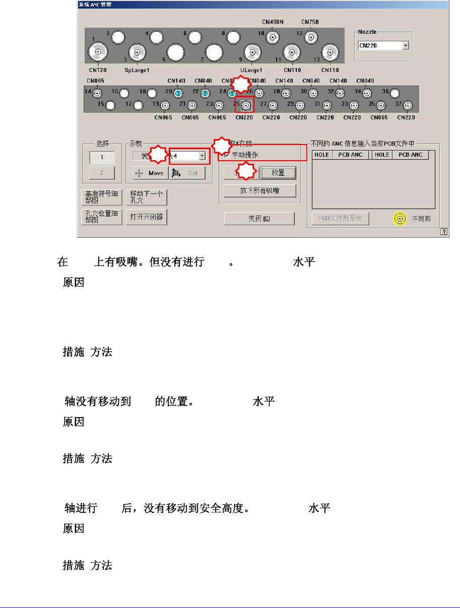 1-41 用手确认该 Head 上有没有吸嘴。 点击 ” READ Y ” 按钮给设备提供电源。 相应 磁头 上实 际存在 吸嘴, 但 在 A NC 菜单的 对话框 中 设置为 错误 发生磁 头上未 贴装 吸嘴的 状 态,则 核对 ‘No r ea l m ot io n( Man ual )’ ,再选 择错 误发生 磁头 后, 选择该磁头上实际配置吸嘴的 A NC 槽,然后点击 <Pick> 重新进行 ANC …
