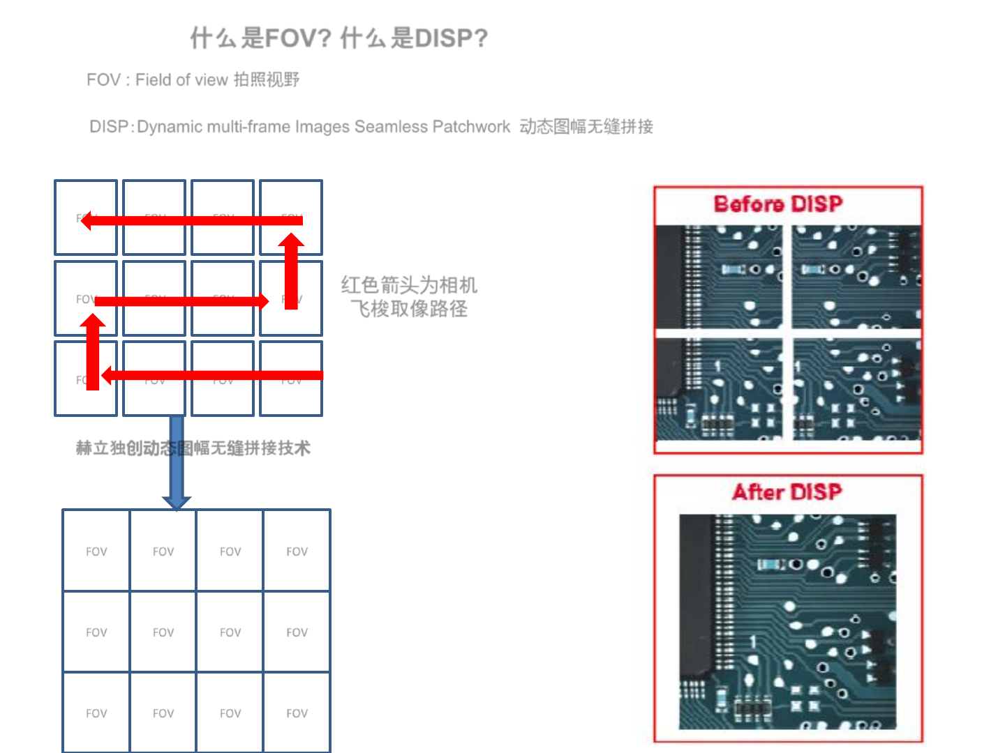 相机通过TOP灯SIDE灯交替闪烁拍照,飞梭抓取FOV图像,最终完成整版无缝拼接取图像扫描