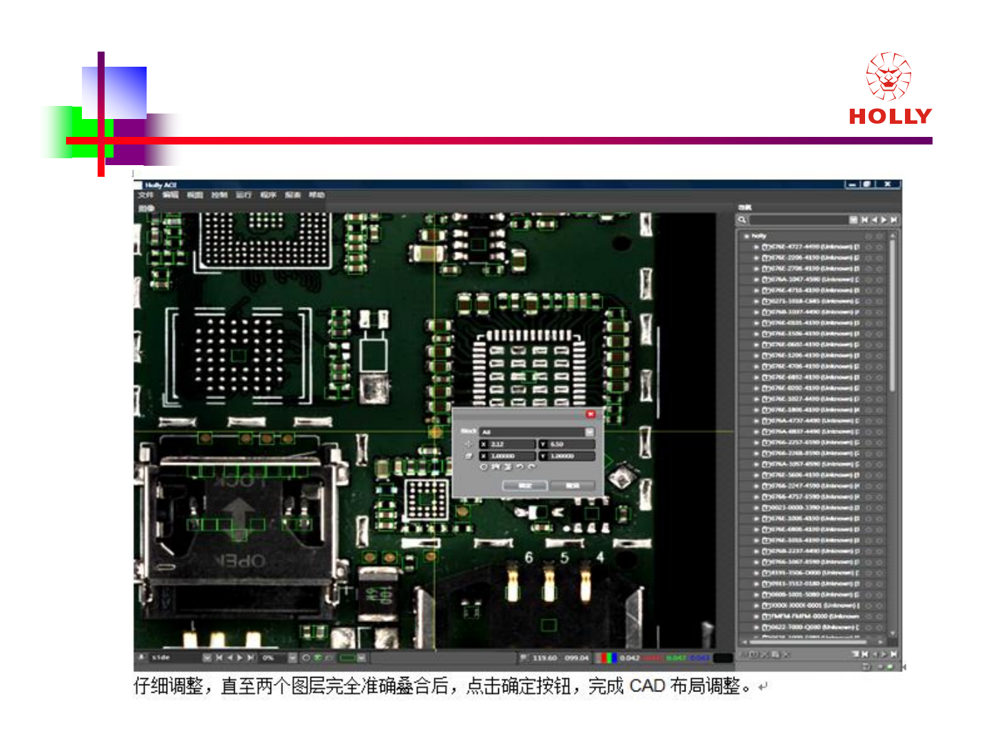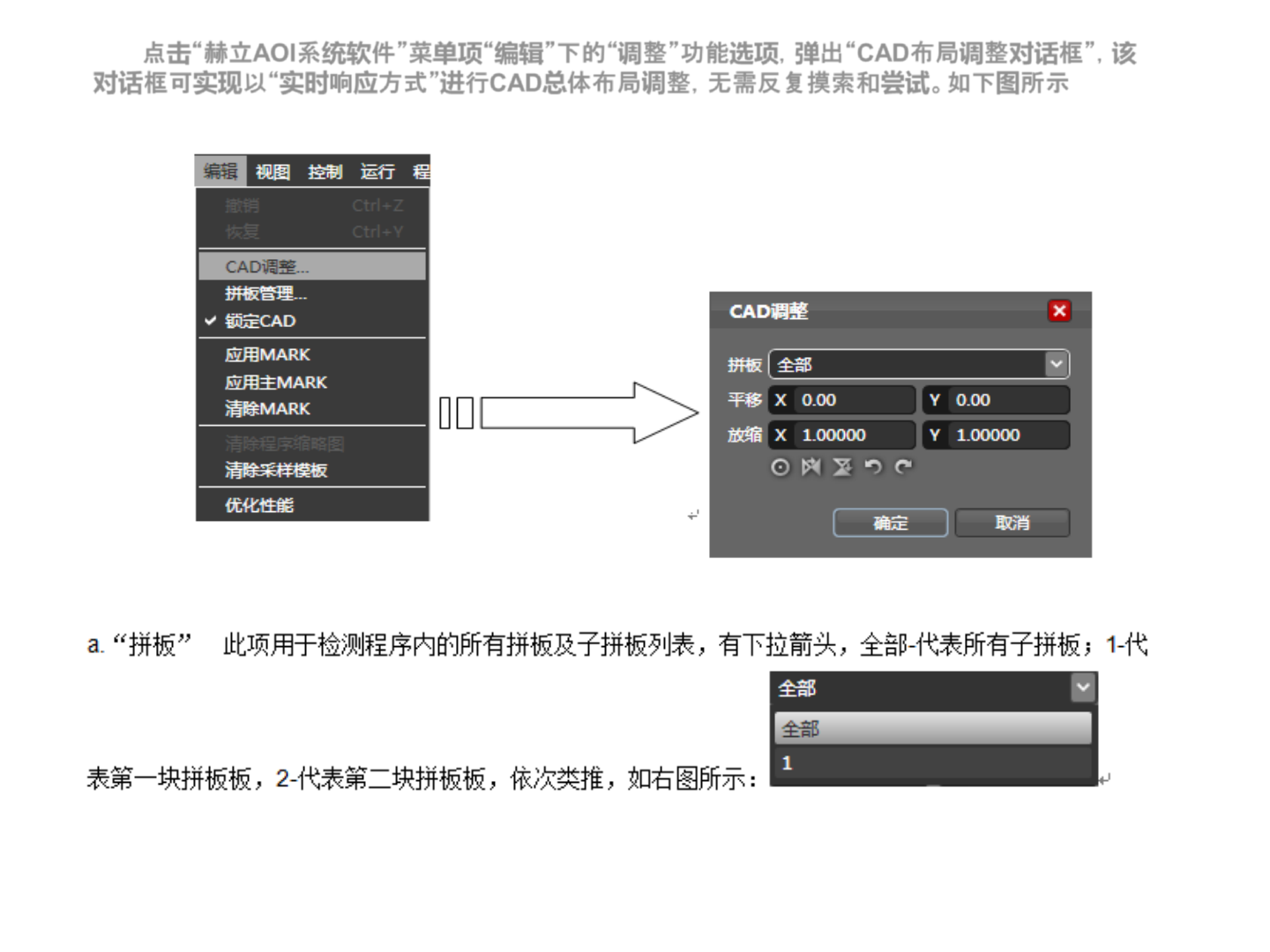 点击“赫立AOI系统软件”菜单项“编辑”下的“调整”功能选项,弹出“CAD布局调整对话框”,该