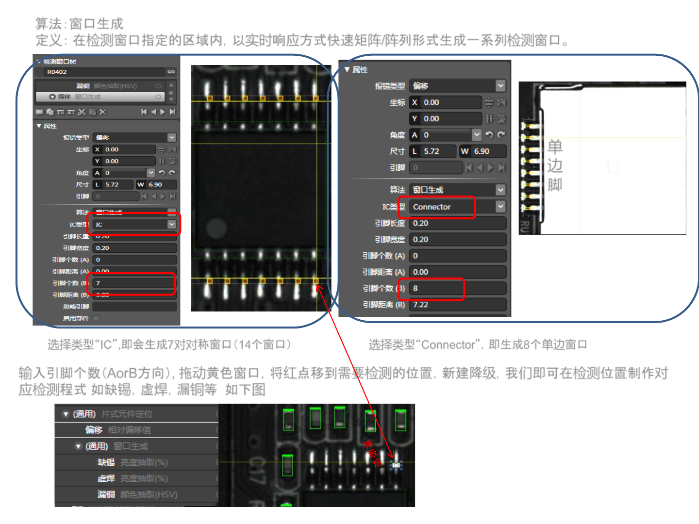 输入引脚个数(AorB方向), 拖动黄色窗口,将红点移到需要检测的位置,新建降级,我们即可在检测位置制作对