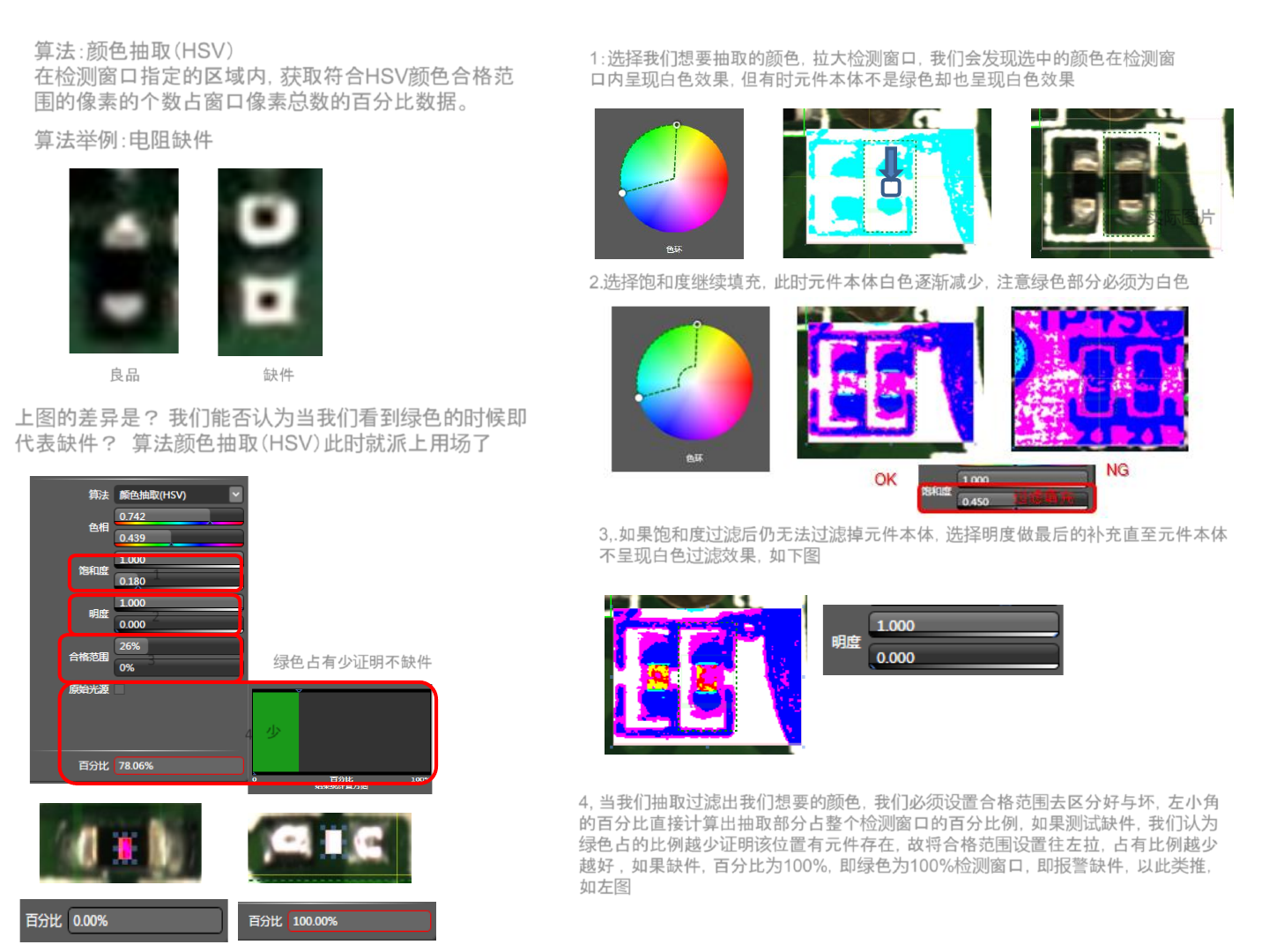 算法: 颜 色抽取( HSV ) 在 检测 窗口指定的区域内, 获 取符合 HSV 颜 色合格范 围 的像素的个数占窗口像素 总 数的百分比数据。 4, 当我 们 抽取 过滤 出我 们 想要的 颜 色,我 们 必 须设 置合格范 围 去区分好与坏,左小角 的百分比直接 计 算出抽取部分占整个 检测 窗口的百 分比例,如果 测试 缺件,我 们 认为 绿 色占的比例越少 证 明 该 位置有元件存在,故将合 格范 围设 置往左拉,占 有比例越…