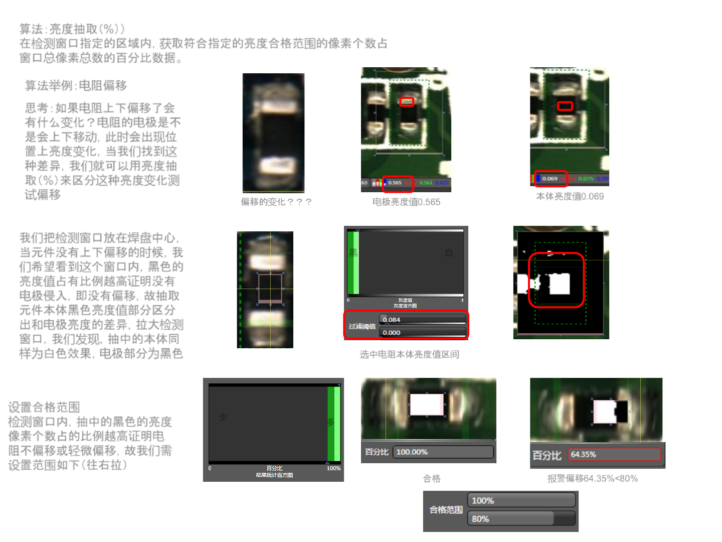 绿色占的比例越少证明该位置有元件存在,故将合格范围设置往左拉,占有比例越少