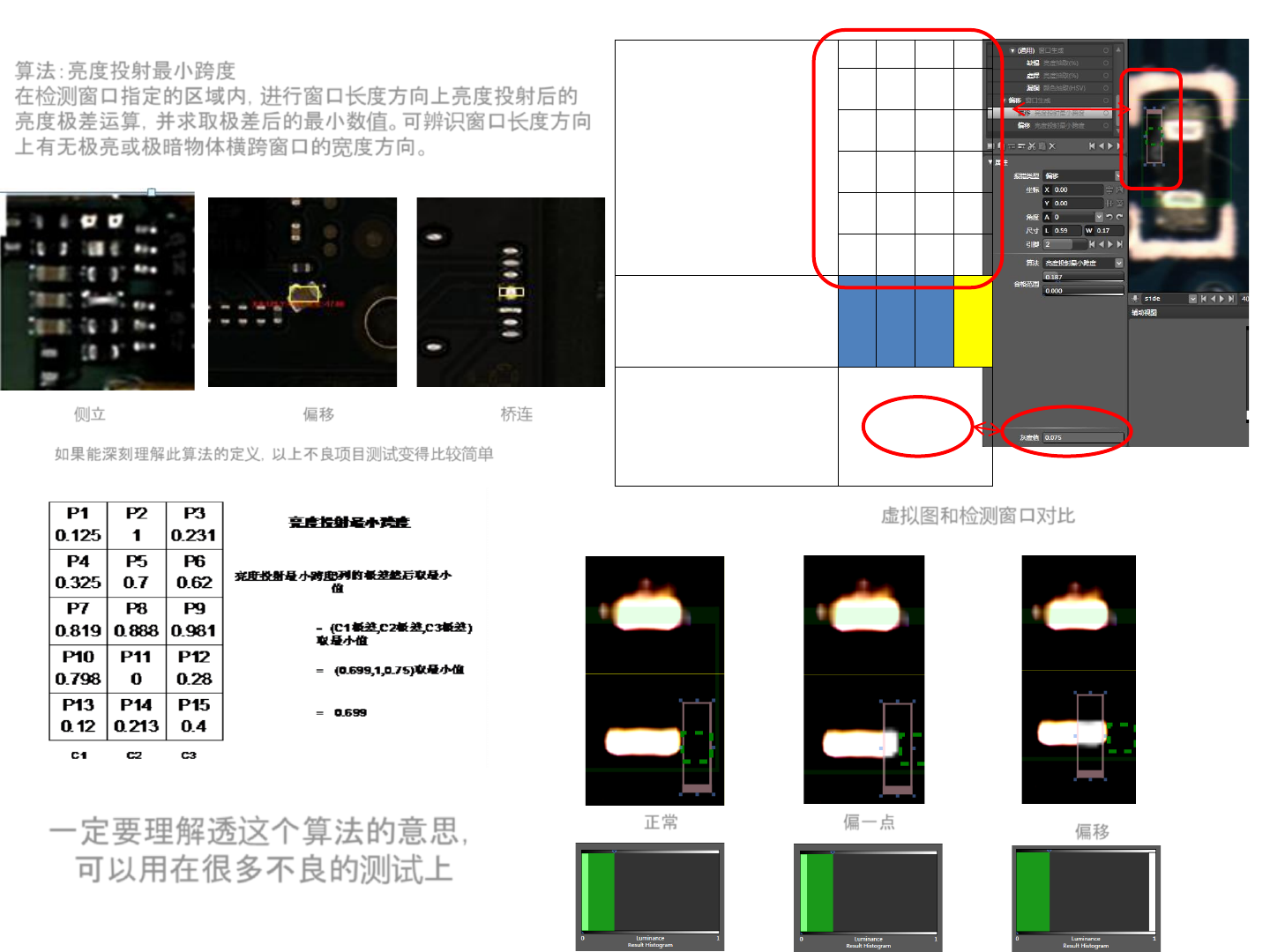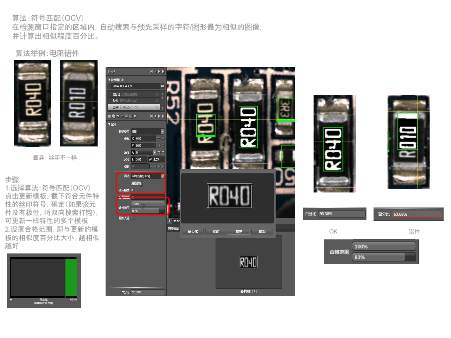 算法:符号匹配( OCV ) 在 检测 窗口指定的区域内,自 动 搜索与 预 先采 样 的字符 / 图 形最 为 相似的 图 像, 并 计 算出相似程度百分比。 算法 举 例: 电 阻 错 件 差异: 丝 印不一 样 步 骤 1. 选择 算法:符号匹配( OCV ) 点 击 更新模板,截下符合元件 特 性的 丝 印符号,确定 (如果 该 元 件没有极性,将双向搜索打 钩 ), 可更新一 样 特性的多个模板 2. 设 置合格范 围 ,即与…