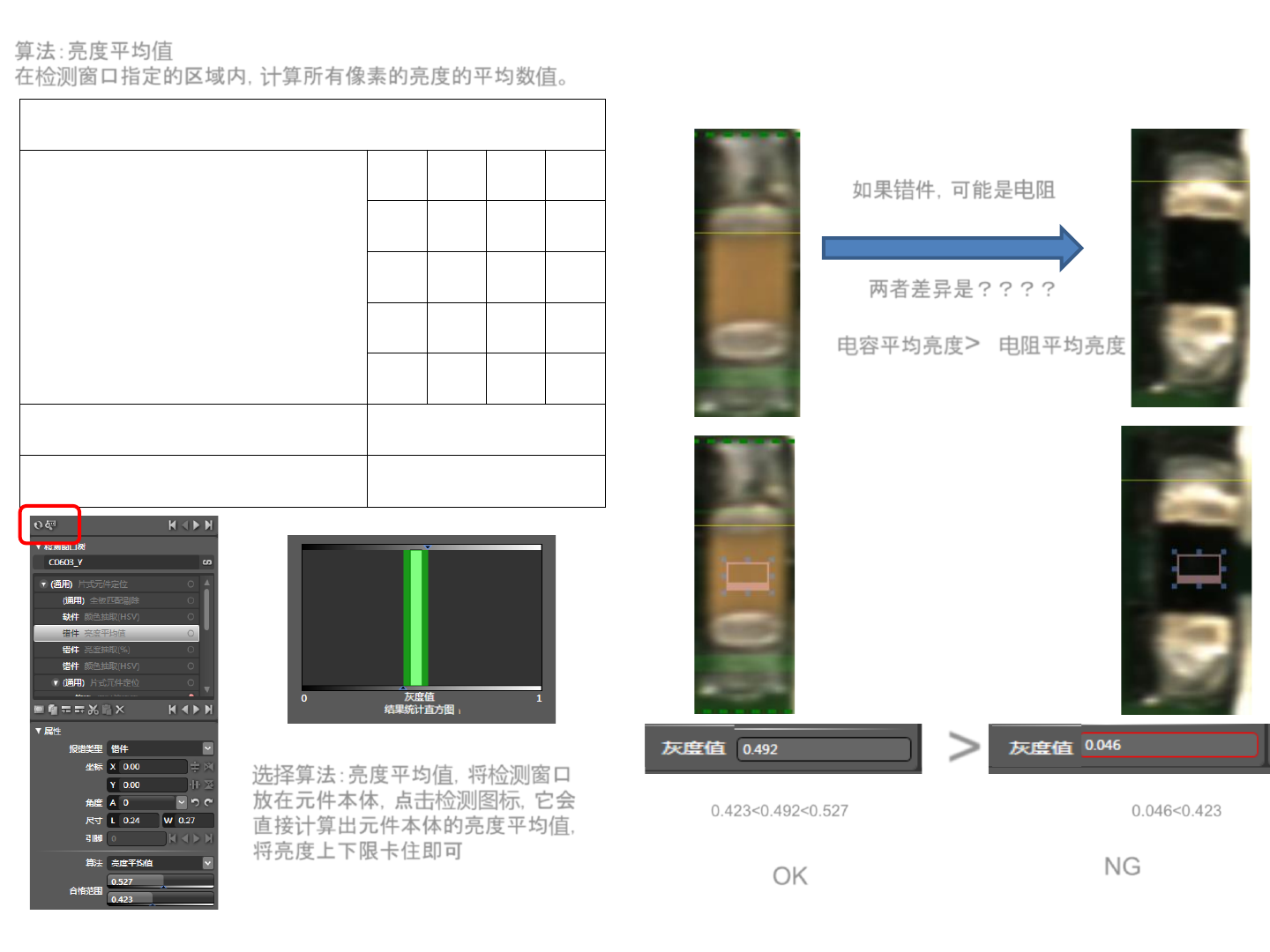 亮度极差 ( IC 引脚偏移举例) 像素亮度值 (夸大假设) 3 1 3 0 2 2 1 0 4 5 0 0 9 4 1 3 3 6 6 6 计算所有像素的亮度的最大值 和最小值之差 检测窗口亮度最大值 : 9 0 1 检测窗口亮度最小值 : 0 0 0 差值 9-0 =9 0 1 选择 此算法 时 ,尽量找到一种非常黑白分明的光源,否 则误报 会多 超出范 围报 警 算法:亮度极差 在 检测 窗口指定的区域内, 计 算所有像素的亮度的…