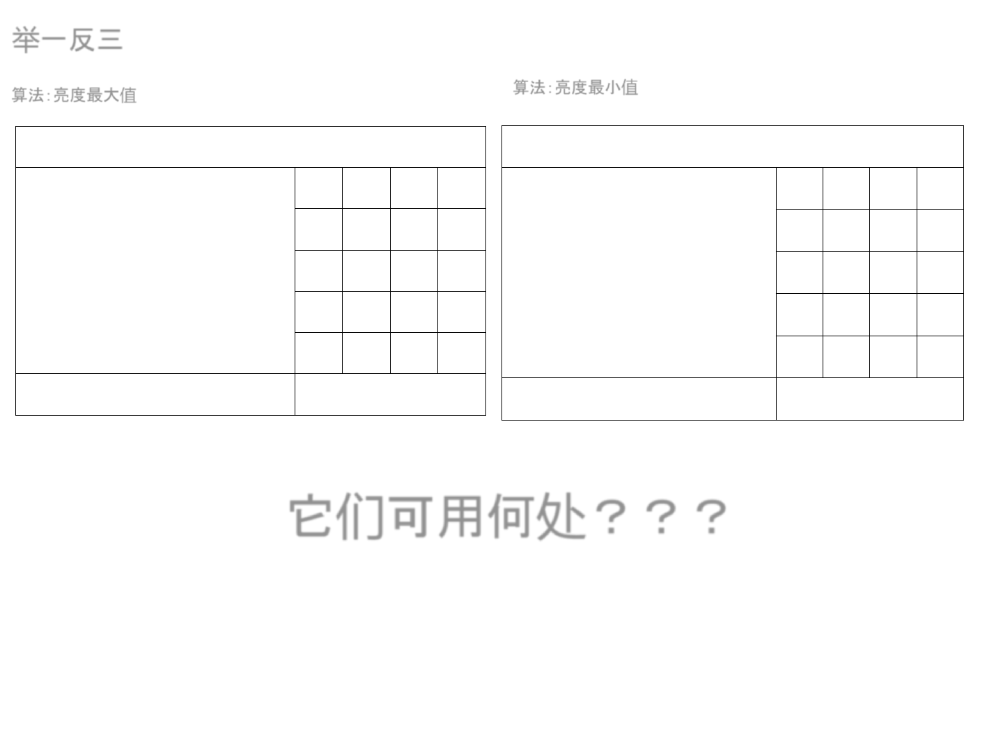 亮度最大值 像素亮度值 (夸大假设) 3 1 3 0 2 2 1 0 4 5 0 0 9 4 1 3 3 6 6 6 亮度最大值 9 算法:亮度最大 值 举 一反三 算法:亮度最小 值 亮度最小值 像素亮度值 (夸大假设) 3 1 3 0 2 2 1 0 4 5 0 0 9 4 1 3 3 6 6 6 亮度最小值 0 它 们 可用何 处 ???