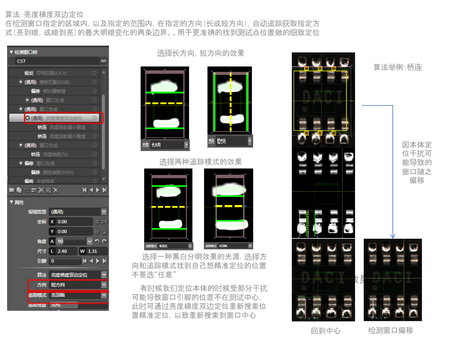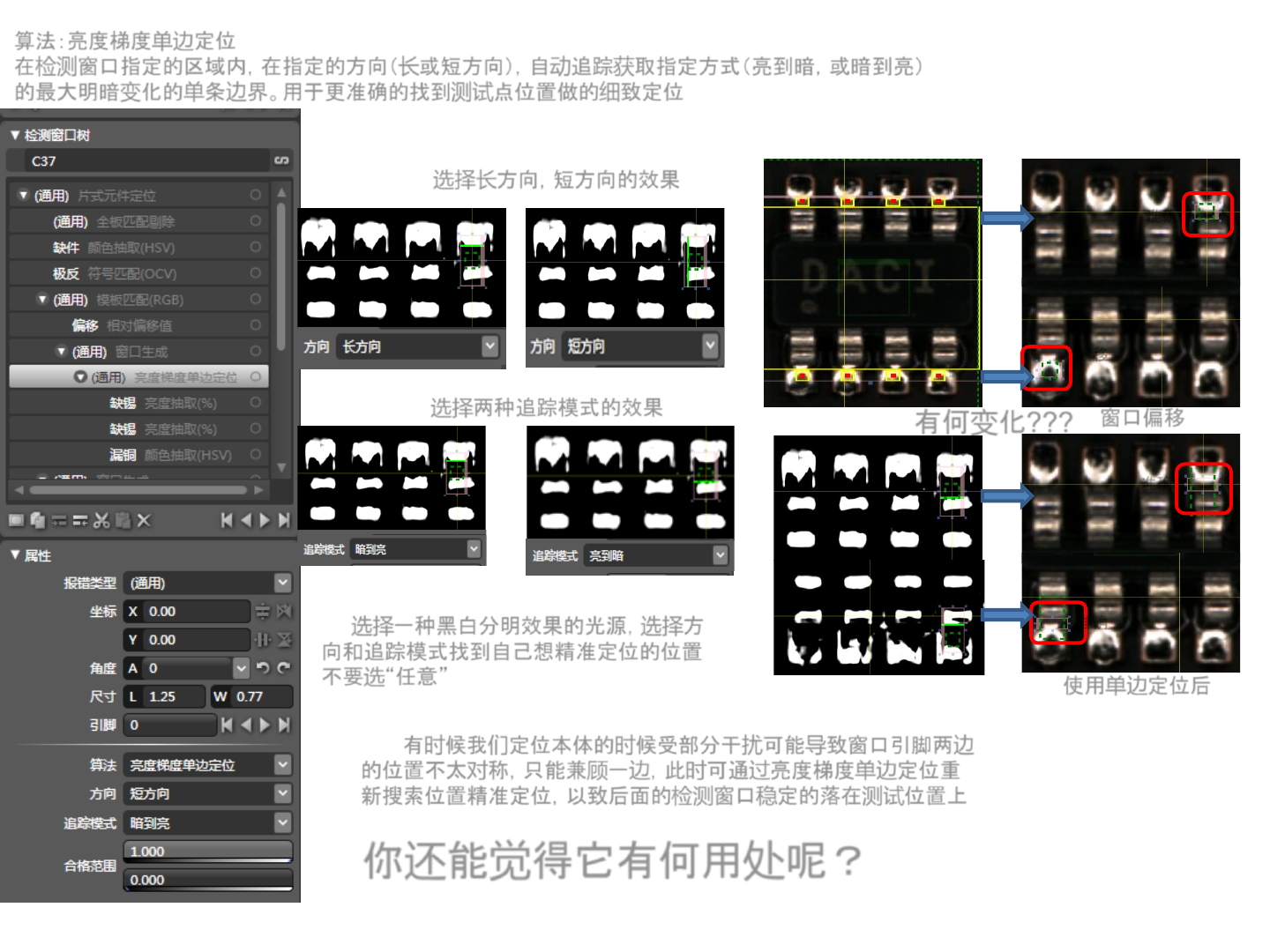 选择 两种追踪模式的效果 选择 一种黑白分明效果的光源, 选择 方 向和追踪模式找到自己想精准定位的位置 不要 选 “任意” 选择长 方向,短方向的效果 有何 变 化 ??? 准确 偏移 窗口偏移 使用 单边 定位后 算法:亮度梯度 单边 定位 在 检测 窗口指定的区域内,在指定的方向( 长 或短方向),自 动 追踪 获 取指定方式(亮到暗,或暗 到亮) 的最大明暗 变 化的 单 条 边 界。用于更准确的找到 测试 点位置做的 细 致定…