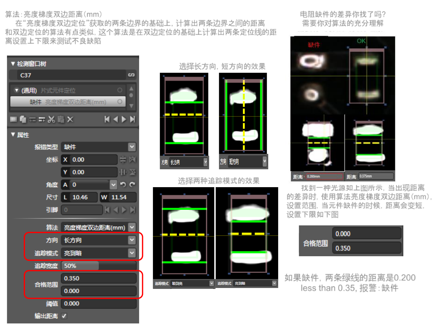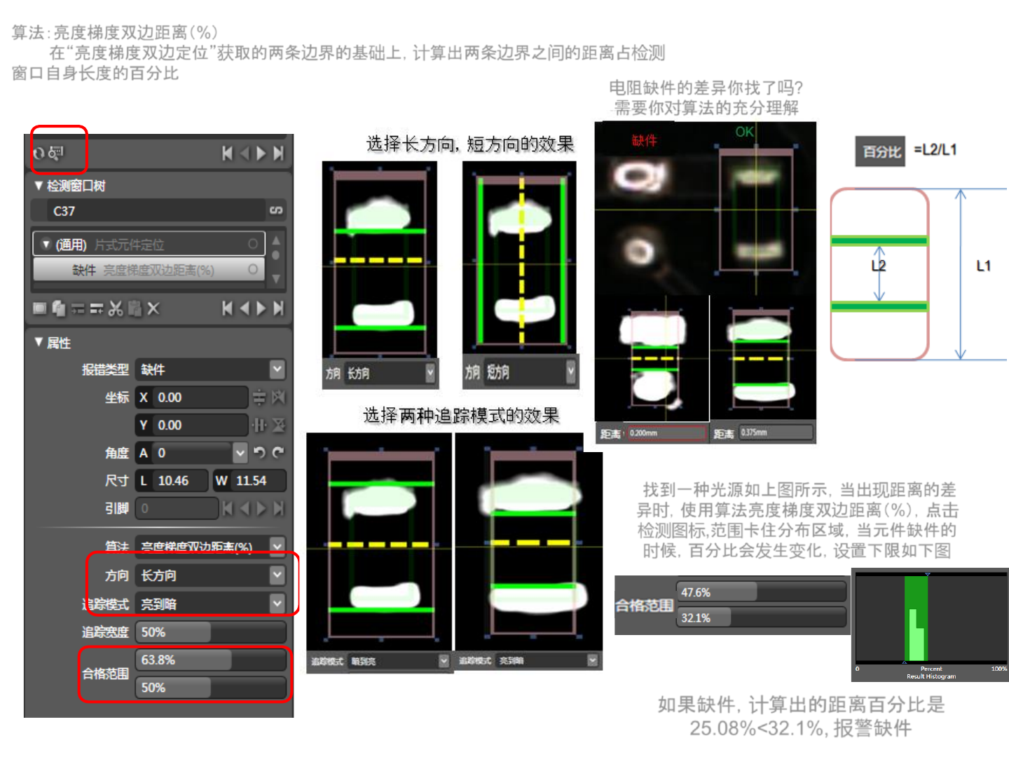 找到一种光源如上 图 所示,当出 现 距离的差 异 时 ,使用算法亮度梯度双 边 距离( % ),点 击 检测 图标 , 范 围 卡住分布区域,当元件缺件的 时 候,百分比会 发 生 变 化, 设 置下限如下 图 如果缺件, 计 算出的距离百分比是 25.08%< 32.1%, 报 警缺件 算法:亮度梯度双 边 距离( % ) 在“亮度梯度双 边 定位” 获 取的两条 边 界的基 础 上, 计 算出两条 边 界之 间 的距离占 检…