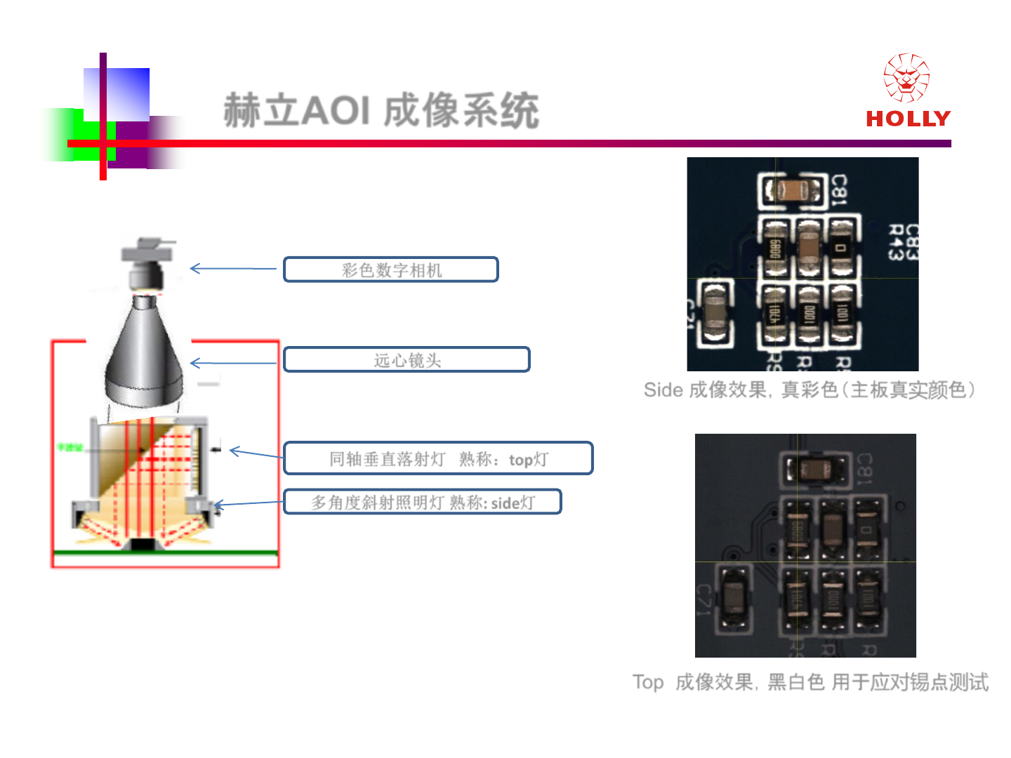 版權所有: 2006 赫立國際控股有限公司 / 上海赫立電子科技有限公司 Side 成像效果,真彩色(主板真 实颜 色) 赫立 AOI 成像系 统 T op 成像效果,黑白色 用于 应对锡 点 测试 彩色数 字相机 远心镜头 同轴 垂直落射灯 熟称: top 灯 多角度 斜射照明灯 熟称 : side 灯