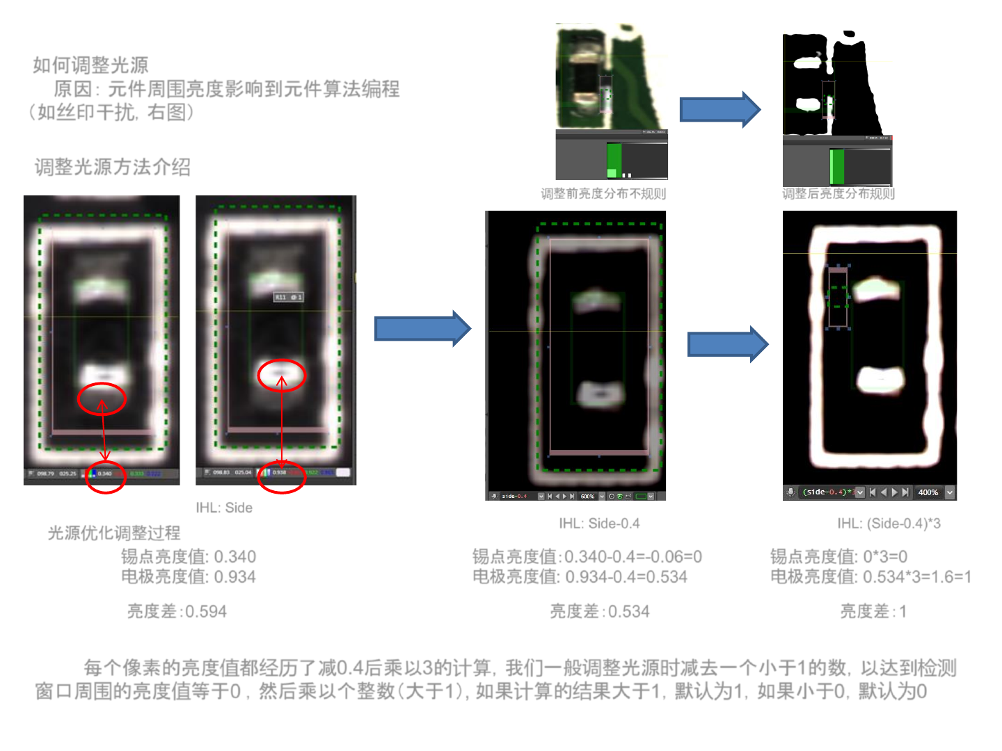 每个像素的亮度值都经历了减0.4后乘以3的计算,我们一般调整光源时减去一个小于1的数,以达到检测