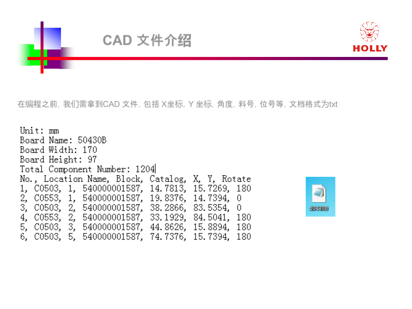 版權所有: 2006 赫立國際控股有限公司 / 上海赫立電子科技有限公司 CAD 文件介 绍 在 编 程之前,我 们 需拿到 CAD 文件,包括 X 坐 标 , Y 坐 标 ,角度,料号,位号等,文档 格式 为 txt