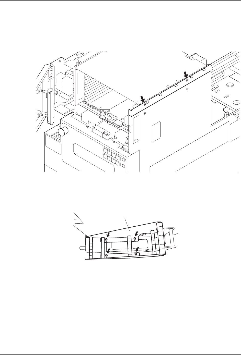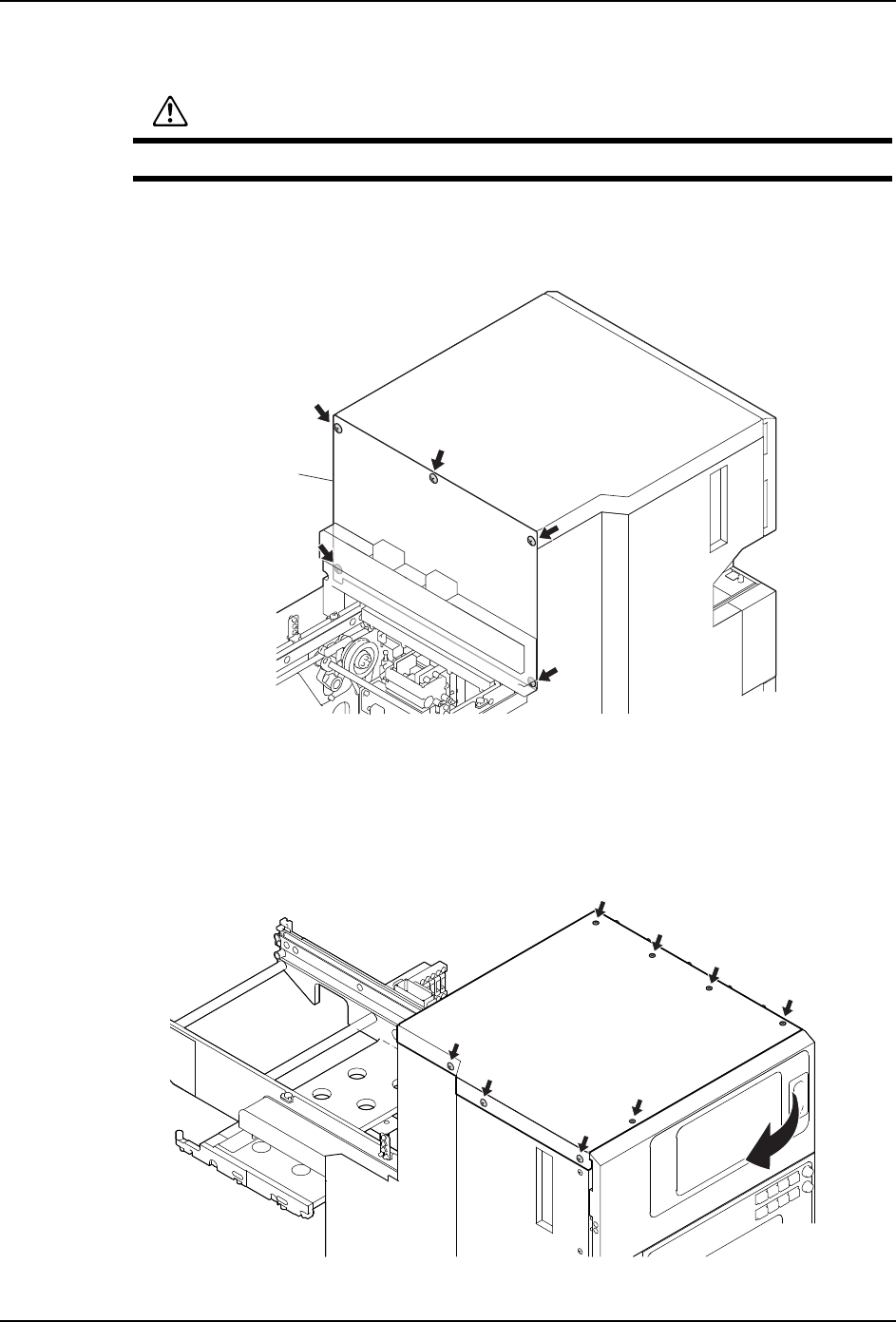 8. 部件的更换 QD145-21 560 NXT II 机械手册 拆除方法 后盖板 1. 请拆除 5 根安装螺丝后拿掉后盖板。 顶盖板 1. 请拆除后盖板。 2. 请打开正门 (上) 。 3. 请拆除 8 根安装螺丝后拿掉顶盖板。 警告 安装 · 拆除料盘单元 -LT 的盖板之前,必须先从机器上拆除料盘单 元 -LT。 30MEC-0285S ৢⲪᵓ 30MEC-0451