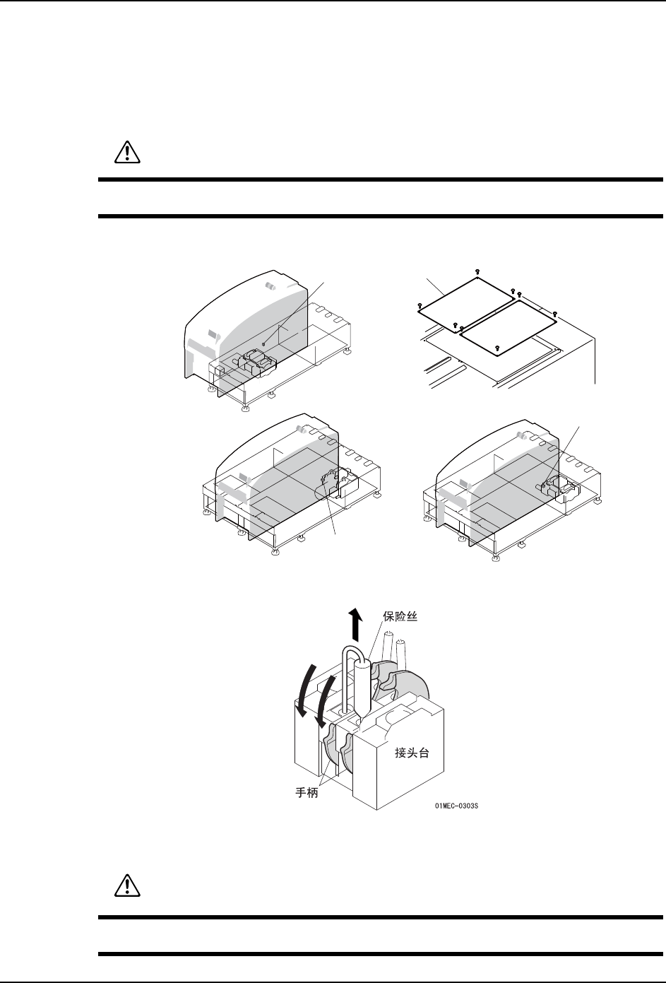 3. 请同时按下接头台的固定保险丝用的 2 个手柄。在此状态下拔下保险丝。