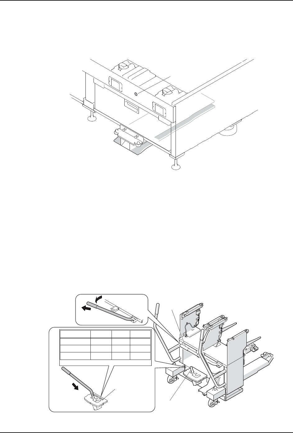 5. 基本操作 QD145-21 132 NXT II 机械手册 3. 请将 PCU-2 拿到 PCU 导轨前,把 PCU-2 前端的滚轮慢慢地插入到 PCU 导轨的漕中。滚轮 碰到 PCU 导轨而不能插入时,请在对应搬送高度 900mm 的 PCU-2 时是蓝色、对应 950mm 的 PCU-2 时是橙色的位置上切换手柄。 注意 )插入 PCU-2 的时候,请慢慢地插入。 搬运高度的公差值对于基准 (900mm、950mm)是从 -5…