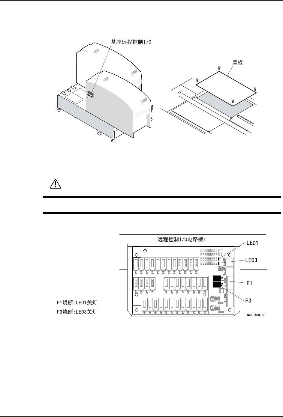 4. 从远程控制 I/O 电路板上拔下保险丝 (F1, F3) 并更换。
