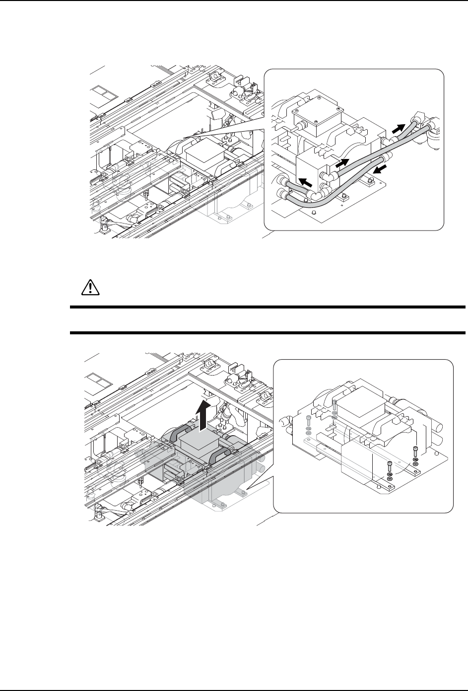 7. 消耗品的更换 QD145-21 462 NXT II 机械手册 7. 取下了的线路,与除了机器以外部 位不接触的那样,用绝缘料带等保 护请固定。 8. 请从真空泵取下软管。 9. 请拆除真空泵的固定螺栓 (4 个 )。请握住手柄,抬起真空泵,从机器基座取出 。 01MEC-1318 警告 请必须在 2 人以上进行操作。决不要在勉强的姿势下抬起泵。有可 能使腰受伤。 01MEC-1319