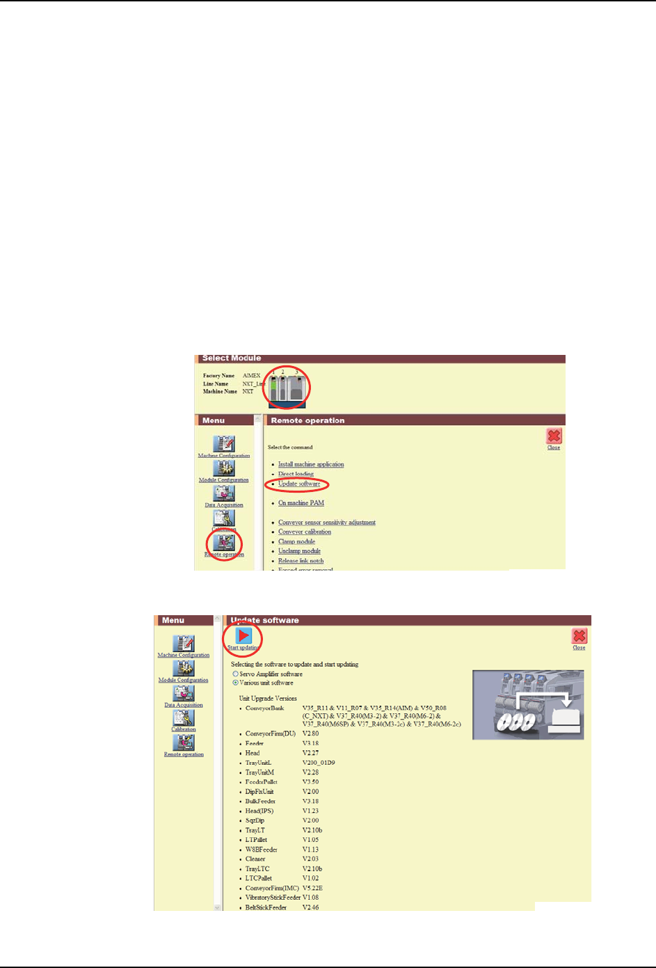 8. 部件的更换 QD145-21 538 NXT II 机械手册 8.14.4 更换控制器后的调整 更换控制器后需要以下作业。 a. 搬运轨道软件的版本升级 b. 搬运轨道校正值 c. 调整搬运轨道传感器灵敏度 进行搬运轨道软件的版本升级 1. 请执行机器手动模式指令的自我诊断指令。详细内容请参照, 「NXT II 系统手册」的 「手动模式指令」 。 2. 请启动辅助软件。 3. 请选择对象模组,单击 [ 远程操作 ]。 4. 请单击…