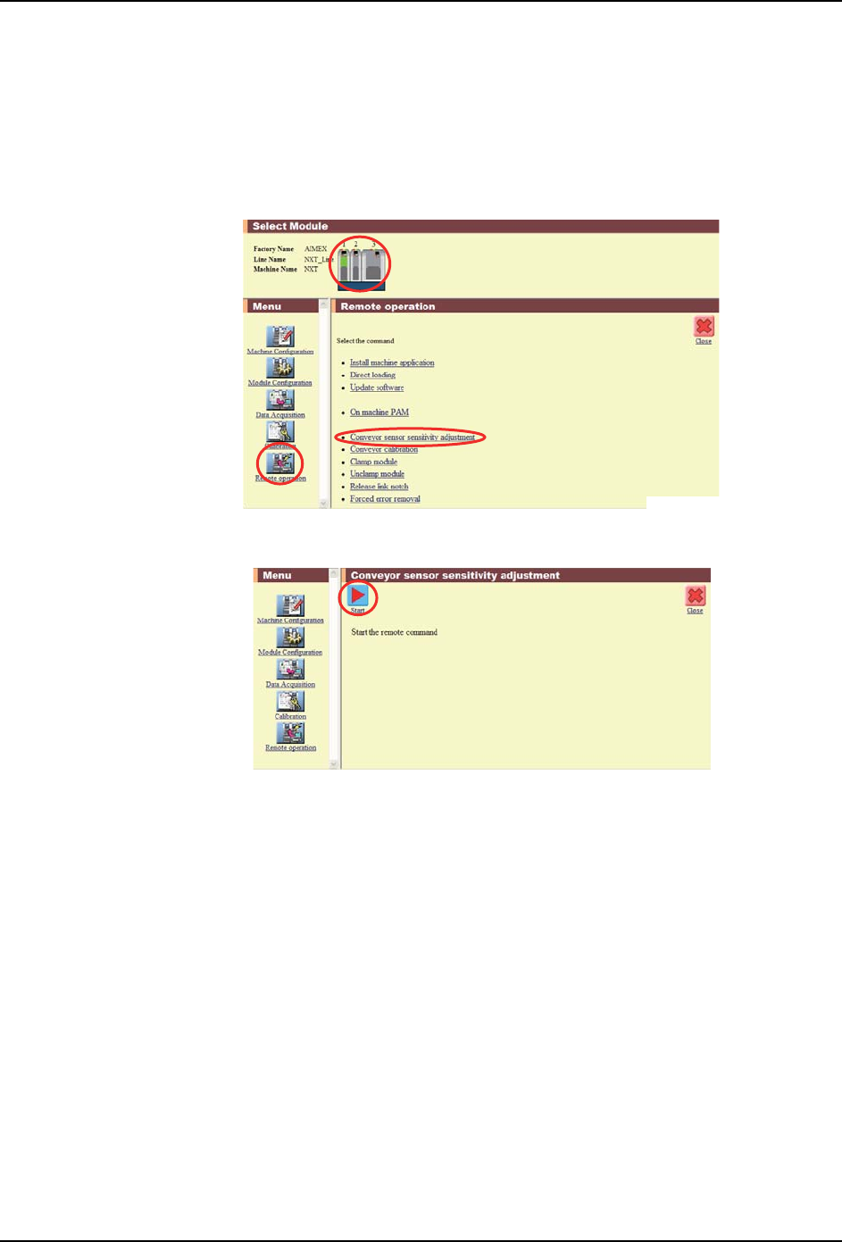 8. 部件的更换 QD145-21 540 NXT II 机械手册 调整搬运轨道传感器灵敏度 1. 请确认搬运轨道传感器间没有电路 板等的遮光物。 2. 请启动辅助软件。 3. 请选择对象模组,单击 [ 远程操作 ]。 4. 请单击 [ 调整搬运轨道传感器灵敏度 ]。 5. 请单击 [ 开始 ]。 01MEC-1233E 01MEC-1234E