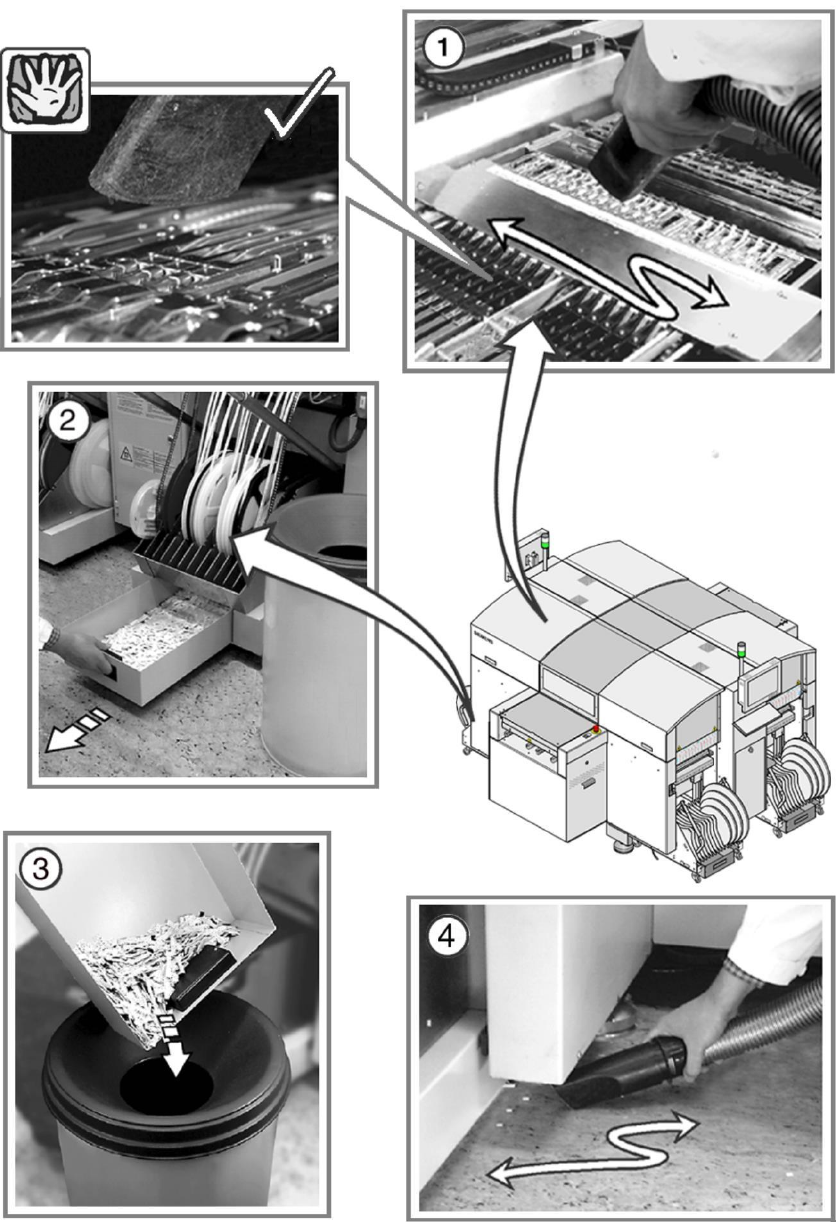 ①使用吸尘器仔细清洁供料器区域。供料器区域中不应有松散元件。