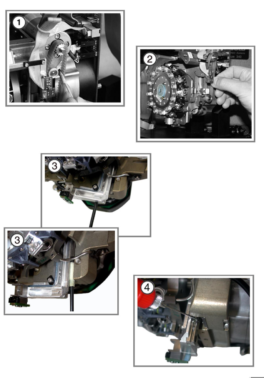 D4 预防性维护 7 4 个月维护 2008 年 8 月中文版 切记遵 守 ESD 规定。 ○ 覆盖 供料 器区域 可保 护供料 器组件 和贴 片头前 部。 ① 打开 应变 消除装 置。 ② 释放 带状 电缆上 方的 夹持器 。 ③ 拉出 两条 带状电 缆。 ④ 松开贴 片头 前部上 的 4 个螺 丝(使 用 3 mm 六角套 筒扳手 ),然后拆下 前部。 拧下螺 丝时 ,握住 贴片头 的前 部。 注意不 要碰 到真空 分配器 。 旋转…