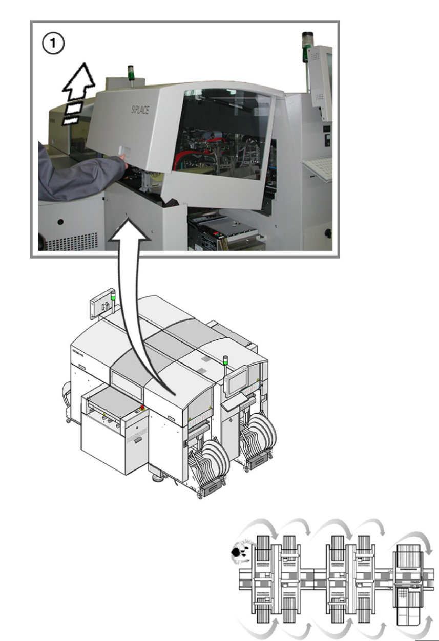①打开保护罩到高度为100 mm (+/-5mm),此高度应为贴片机机架和保护罩边缘之间所测得的