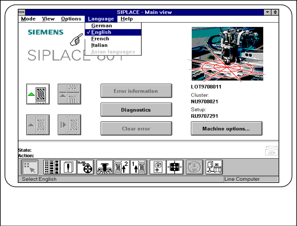SIPLACE 80S-20/F4/F4-6/F5 User’s Manual 2 Introduction and Basic Concepts Edition 03/98 from Software V ersion SR.404.xx 2.4 Brief D escription and Principles of the User Interface 2 - 49 2.4.7 Display box The disp lay b…