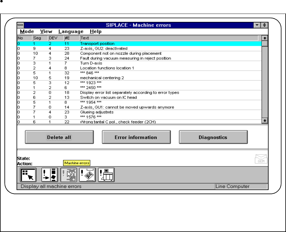 3 Placement Functions SIPLACE 80S-20/F4/F4-6 User’s Manual 3.3 Error Edition 07/97 from Software Version SR.403.xx 3 - 16 3.3.2 Machine Errors Click o n the symbol button for Error s in the Disp lay all machine error s m…