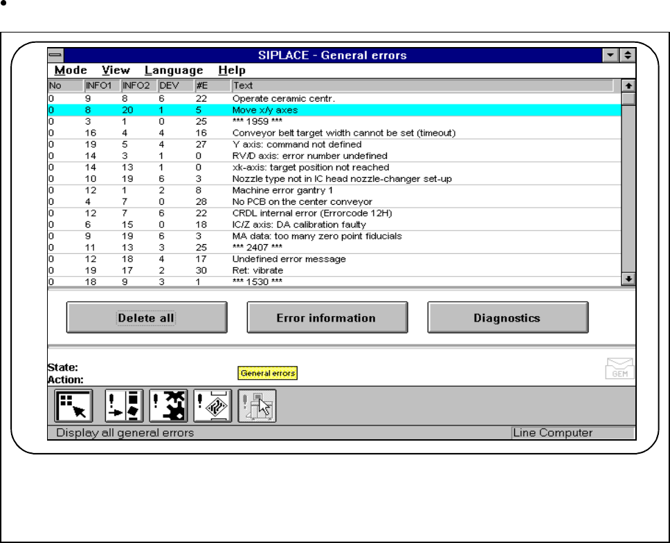 SIPLACE 80S- 20/F4/F4-6 User’s Manual 3 Placement Functions Edition 07/97 from Software Version SR.403.xx 3.3 Error 3 - 21 3.3.4.1 Error Information Mark a single lin e (highlig hted aga inst a bl ue bar) and click on th…