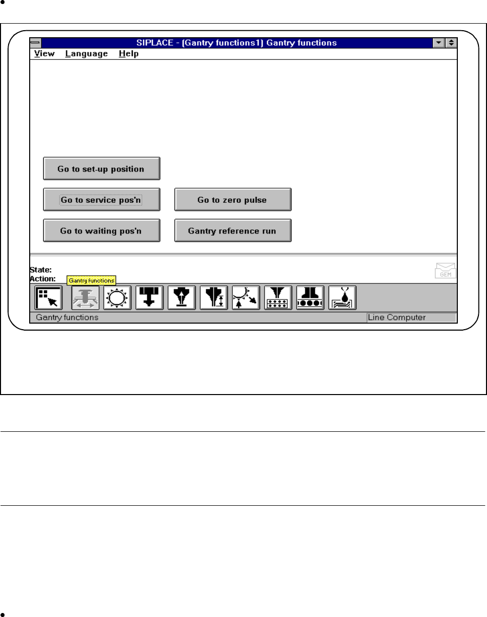 SIPLACE 80S- 20/F4/F4-6 User’s Manual 4 Single Functions Edition 07/97 from Software Version SR.403.xx 4.2 Single Functions, Gantry with 12x Revolver Head 4 - 7 4.2. 1.2 Go to S ervice P osit ion At the service position …