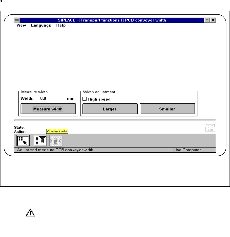 SIPLACE 80S- 20/F4/F4-6 User’s Manual 4 Single Functions Edition 07/97 from Software Version SR.403.xx 4.4 Single Functions: Transport 1 4 - 49 4.4.2 Conveyor Width It will be necess ary to a lter the width of the con ve…