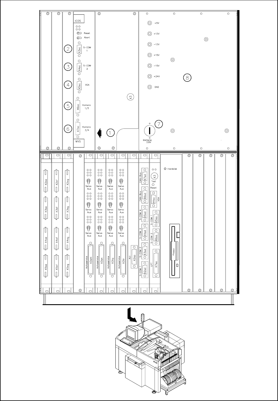 The control unit of the machine accommodates an evaluation unit (ICOS MVS system) (see Fig. 5.1.4, Page