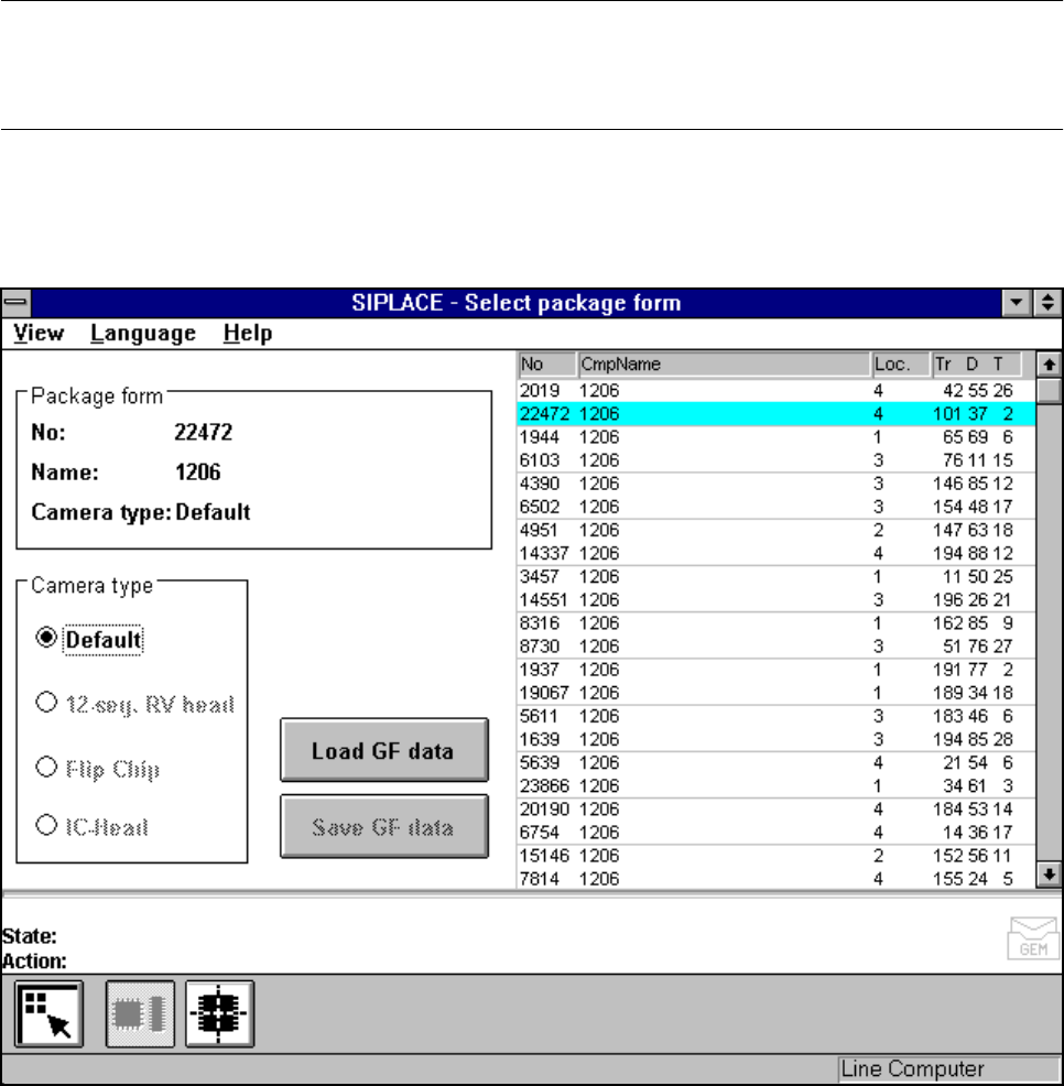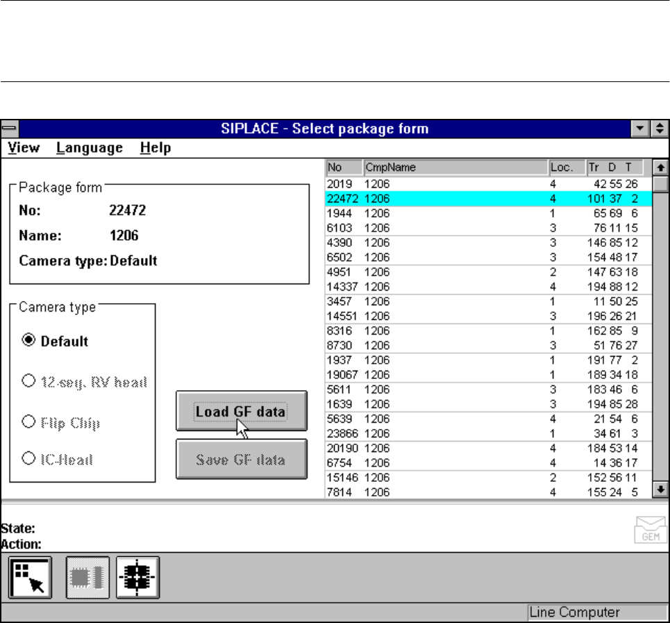 5 Vision Functions SIPLACE 80S-20/F4/F4-6/F5 User’s Manual 5.6 Test Component Edition 03/98 from Software Version SR.404.xx 5 - 80 Line engine er 5.6. 3.2 Load GF data Option NOTE When you call t he Load GF data o ption,…