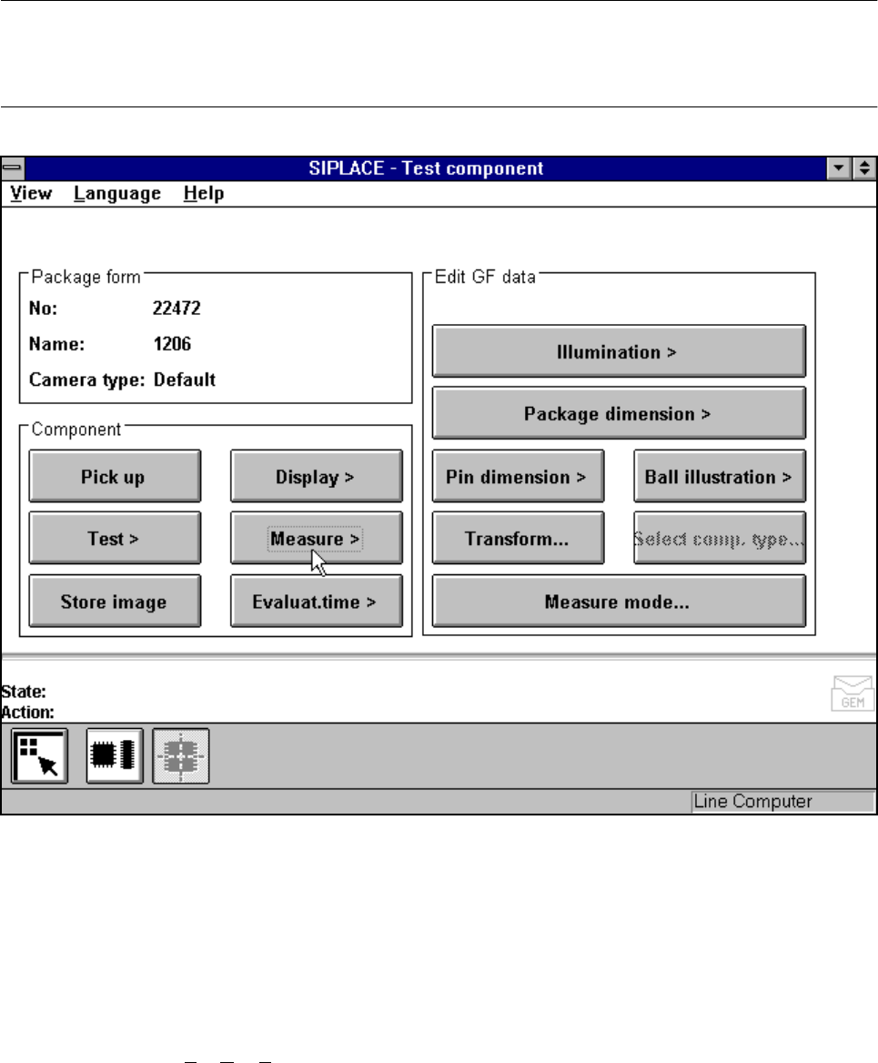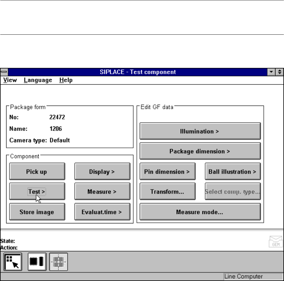 SIPLACE 80S-20/F4/F4-6/F5 User’s Manual 5 Vision Functi on s Edition 03/98 from S oftware Version SR.404.xx 5.6 Test Component Line engi neer 5 - 87 Fig. 5.6.13 Test component menu, Test component video image With the Re…