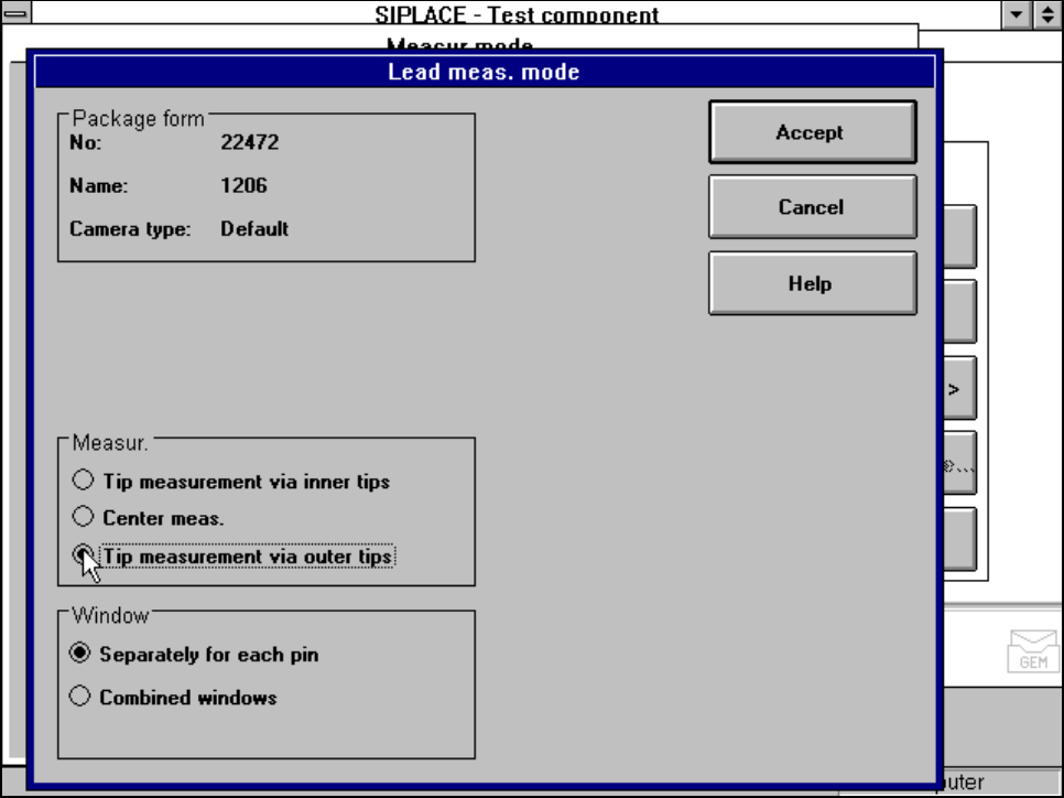 5 Vision Functions SIPLACE 80S-20/F4/F4-6/F5 User’s Manual 5.6 Test Component Edition 03/98 from Software Version SR.404.xx 5 - 116 Line engine er Fig. 5.6.30 Measuring mode option, C orner measuring mode menu This menu …