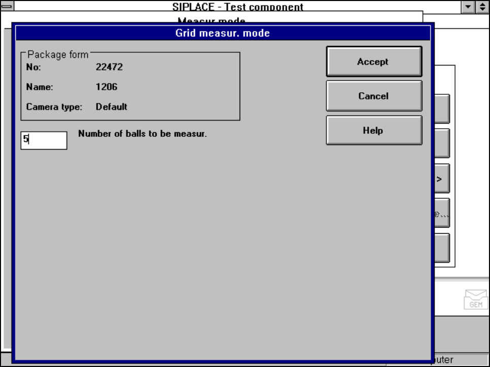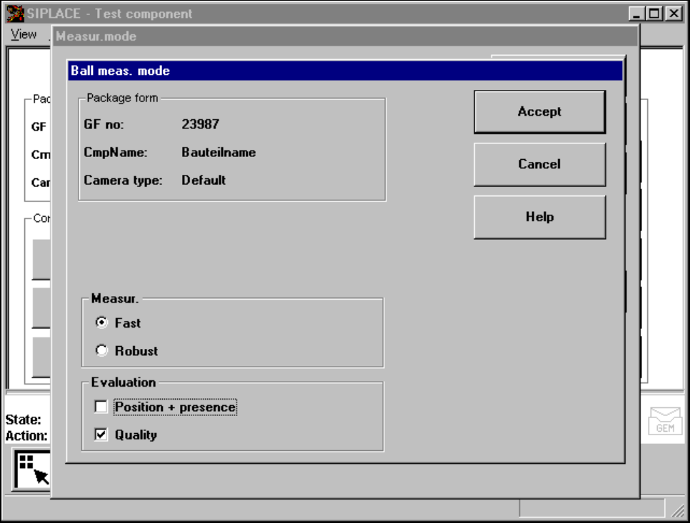 SIPLACE 80S-20/F4/F4-6/F5 User’s Manual 5 Vision Functi on s Edition 03/98 from S oftware Version SR.404.xx 5.6 Test Component Line engi neer 5 - 119 5.6. 4.21 ’Ball’ measuring mode Click o n the ’Se ttings ’ button in ’…