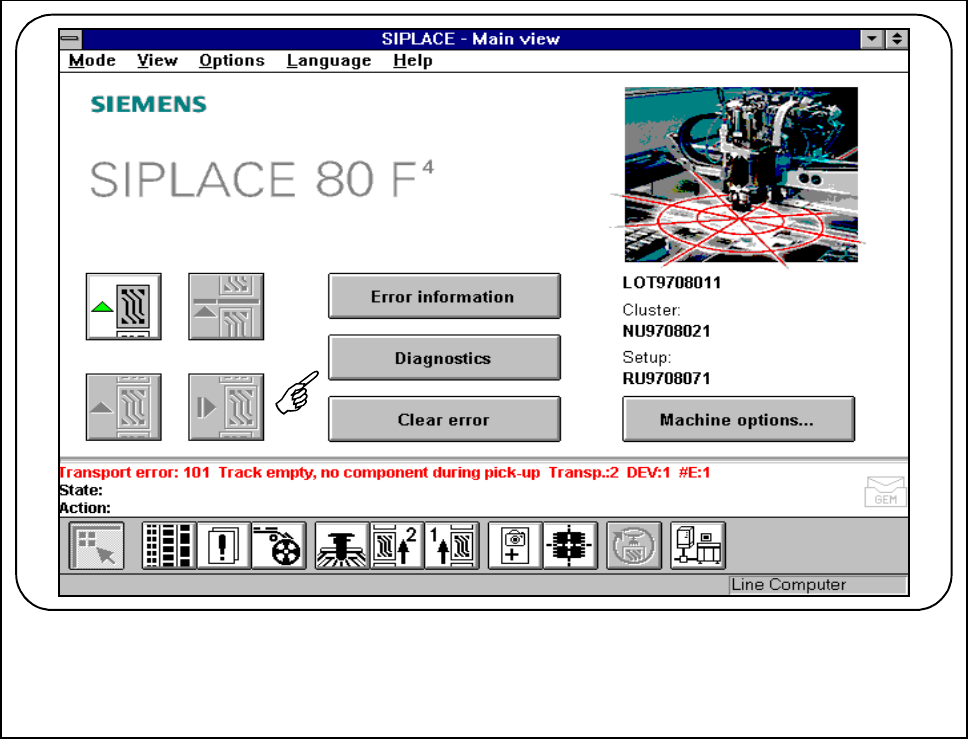 SIPLACE 80S- 20/F4/F4-6 User’s Manual 7 E rror Information & Diagn ostics Edition 03/98 from Software Version SR.403.xx 7.2 Diagnostics 7 - 9 7.2 Diagnost ics 7.2.1 General Comments If errors o ccur while the boa rd …