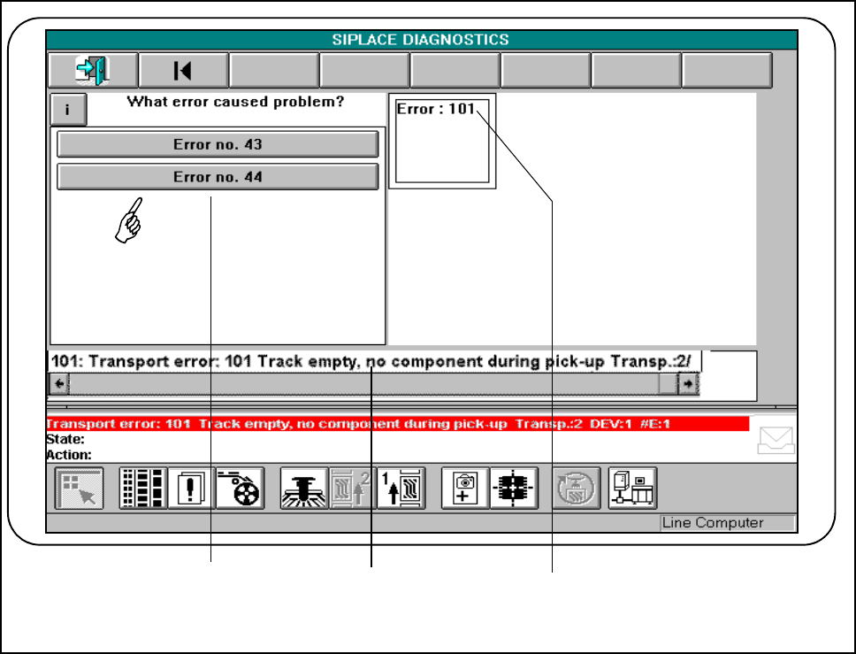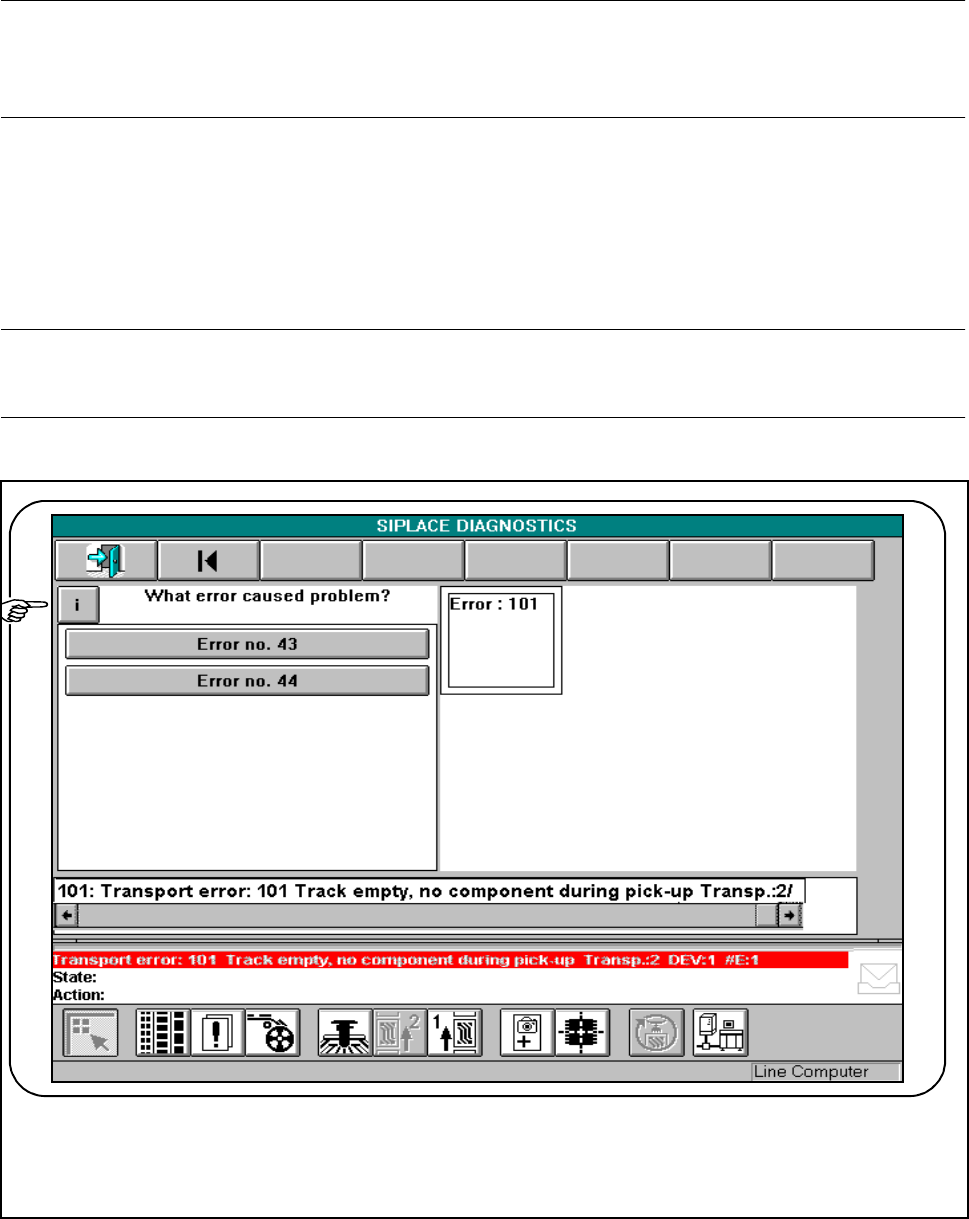 SIPLACE 80S- 20/F4/F4-6 User’s Manual 7 E rror Information & Diagn ostics Edition 03/98 from Software Version SR.403.xx 7.2 Diagnostics 7 - 15 7.2.3 Procedu re NOTE The proc edure is ex plained with the hel p of an e…