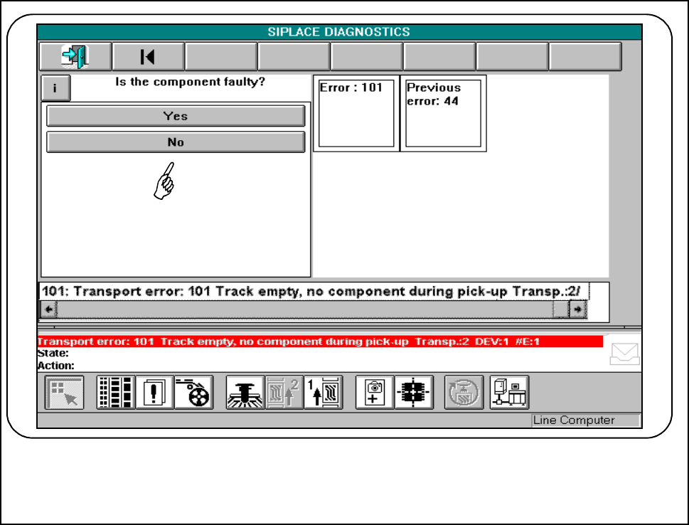 7 Error Information & Diagnostics SIPLACE 80S-20/F4/F4-6 User’s Manual 7.2 Diagnostics Edition 03/98 from Software Version SR.403.xx 7 - 16 ● Click o n the OK bu tton and an swer the q uestions as ked by cl icking on…