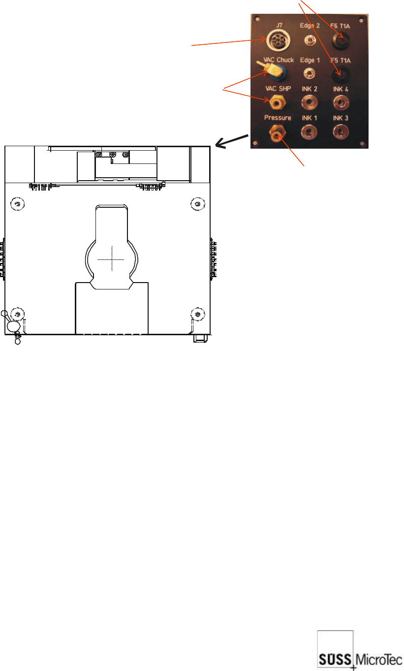 SUSS / PA300 / User Manual / M10-121841-00 / February 2002 19 4.2.2 Non-electrical Utilities Connect vacuum and air or nitrogen at the right rear corner of the mechanics: Fuses Optional 24V / 5V power supply Compressed a…