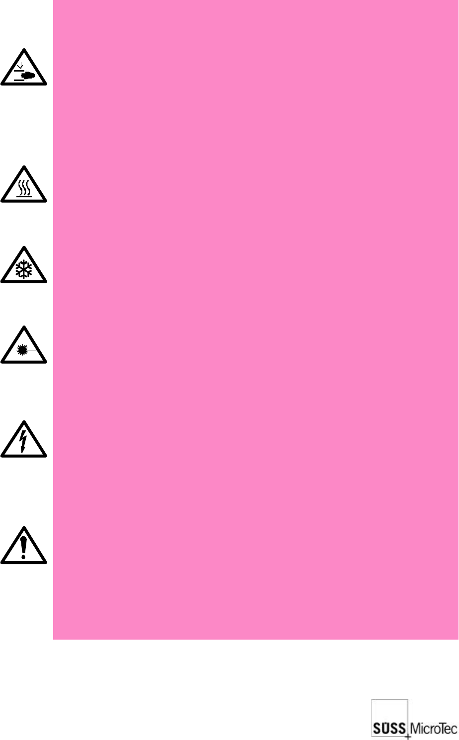 SUSS / PA300 / User Manual / M10-121841-00 / February 2002 5 Safety Instructions and Symbols D US F I Achtung, bewegte Teile! Verletzungsgefahr! Im eingeschalteten Zustand nicht hineingreifen! Attention, moving parts! Da…
