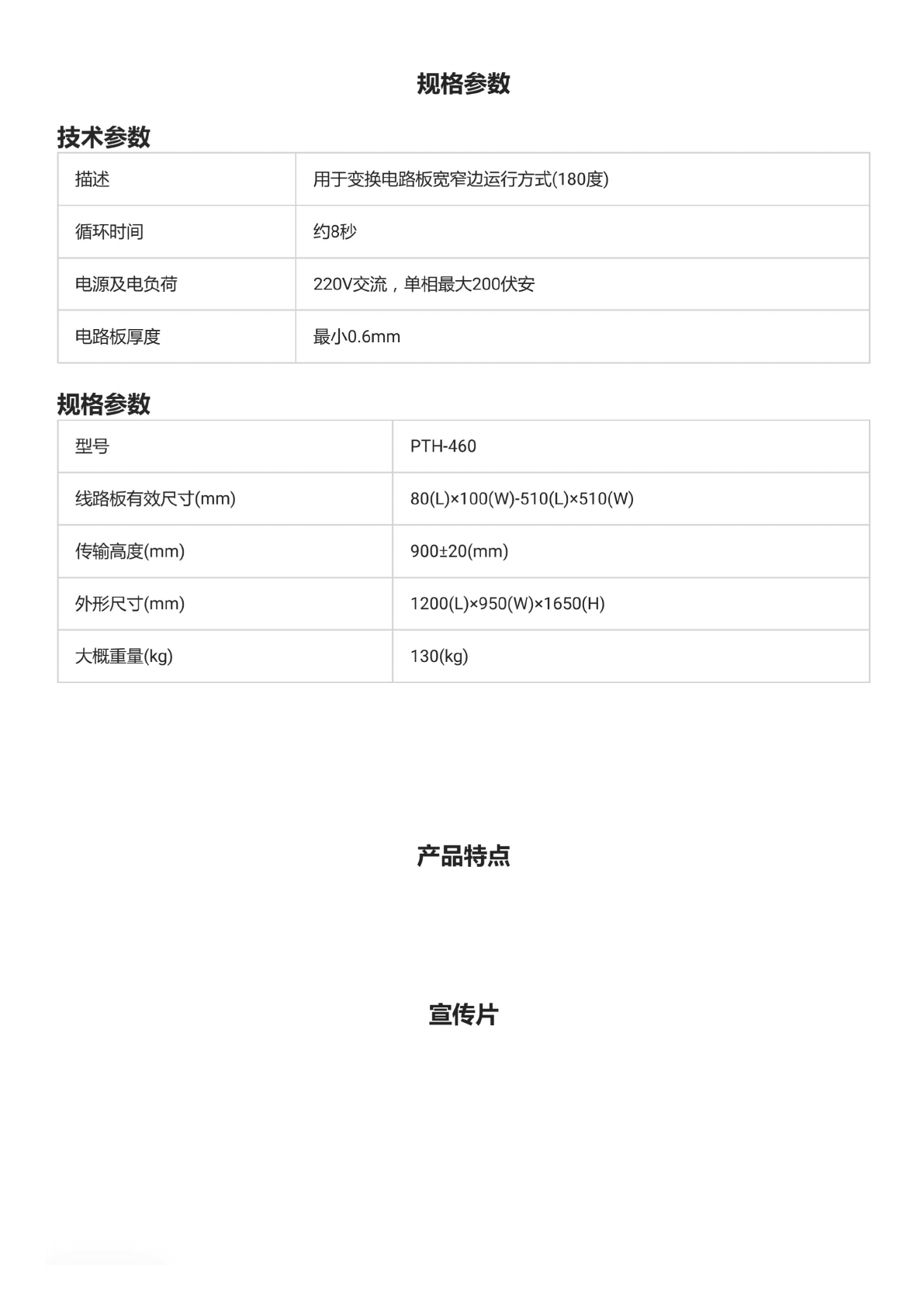 换边 输送机 产品 型号: PTH-460 • PLC 控 制系统 , 彩色触 摸屏操 作界面 ; • 步进 传动、 位移、 旋 转系统 , 高 效稳定 , 定位 精准; • 教导 式设定 操作, 全数 字设定 , 操作简 单易懂 ; • 进出板 位置、 方向 可自由 选择; • 宽进 窄出、 窄进 宽出、 直通 等多种 工作模 式可选 ; • 兼容的 SMEMA 通信 方式。