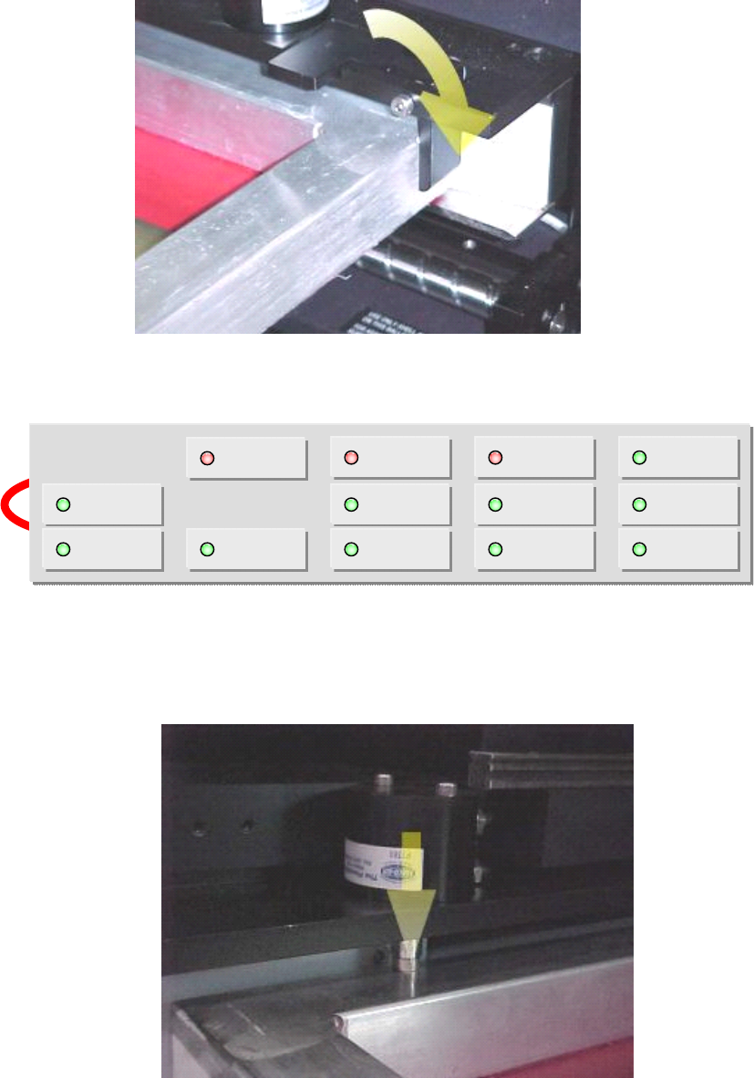 5-HR90-7000-011 Page 26 of 51 12 . 印刷机設置 • 搖動框架定位器向下并拉印网后直至相接触 . • 用 SEL ECT 按鈕按下 FRAME CLAMP 鎖定印网在合适位置 . • 四個框架夾可保護印网 . FRAME CLAMP SQUEEG EE CLAMP SQUEEG EE UP/DOW N SQUEEG EE FLI P VACUUM MOTOR VACUUM GATE ECU ON/OFF …