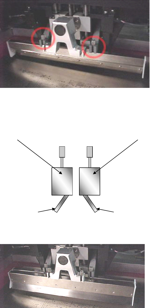 5-HR90-7000-011 Page 28 of 51 12 . 印刷机設置 • 首先決定刮刀裝入的順序 . • 帶最遠的螺絲的刮刀始終第一個裝入 . • 后刮刀將從机器的后面印向前面 , 這稱為 前至后印刷 . 為了完成這個動作 , 刮 刀必須以正确的方向插入 . • 當后刮已被固定 , 插入前刮 . 如下圖 . 后刮 前刮 注意后刮面朝向印网的 后面 注意前刮面朝向印网的 前面