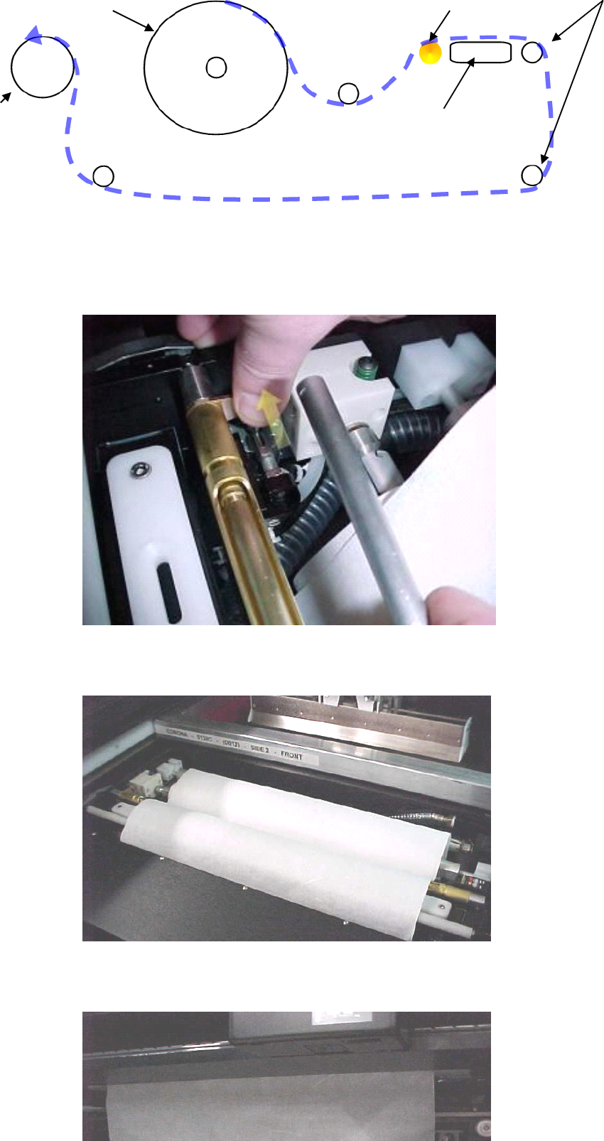 • 擦机紙穿過擦机單元下面和兩個白色滾筒周圍 .